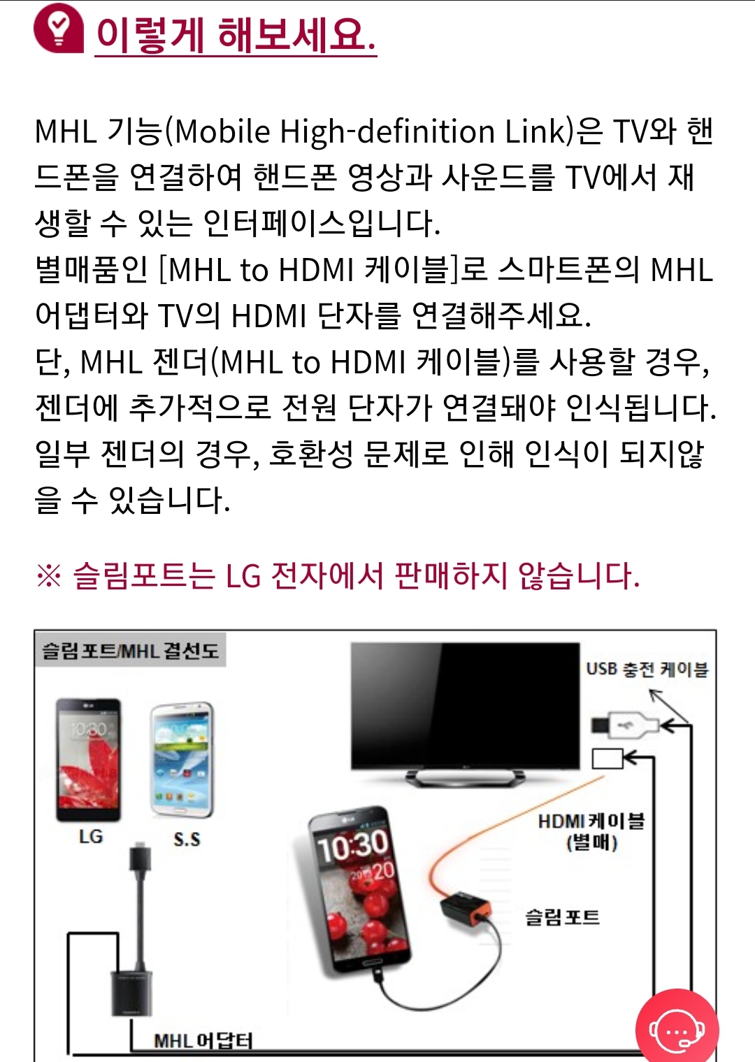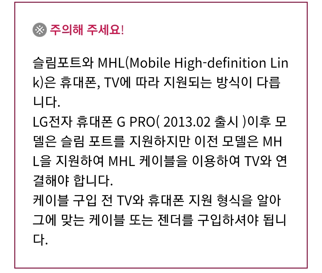 제품 문제 해결 : [LG TV 스마트폰 연결] Miracast 또는 MHL포트를 이용하여 휴대폰과 TV를 연결하고 싶