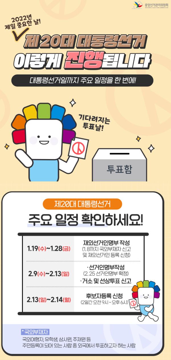 | 20대 대통령선거(2022. 3. 4(금)~3.5(토) 사전투표, 3.9(수) 선거일투표, 06시~18시/확진자·자가격리자투표 18시~19:30 (0) | 2022.02.23 |