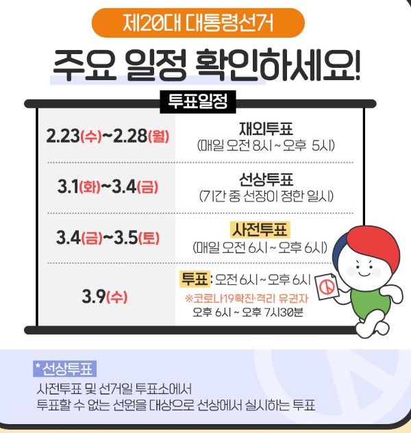 3.4(금)~3.5(토) 사전투표일에는 누구나 투표할 수 있습니다. 하지만 3.9(수) 본투표일에는 지역 주민만 투표할 수 있습니다.