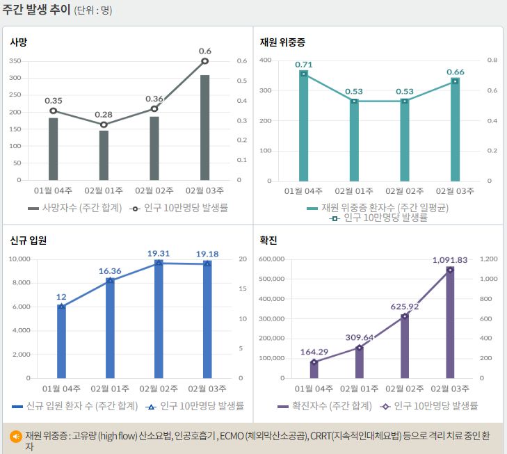 주간 확진자 급증이 몇 주간 지속되며, 사망률과 위중증환자 발생률과 수치 모두 따라 오르고 있습니다. 신규입원은 적지만 그건 오늘까지 하면 50만 명 넘게 재택치료자로 분류했기 때문입니다.