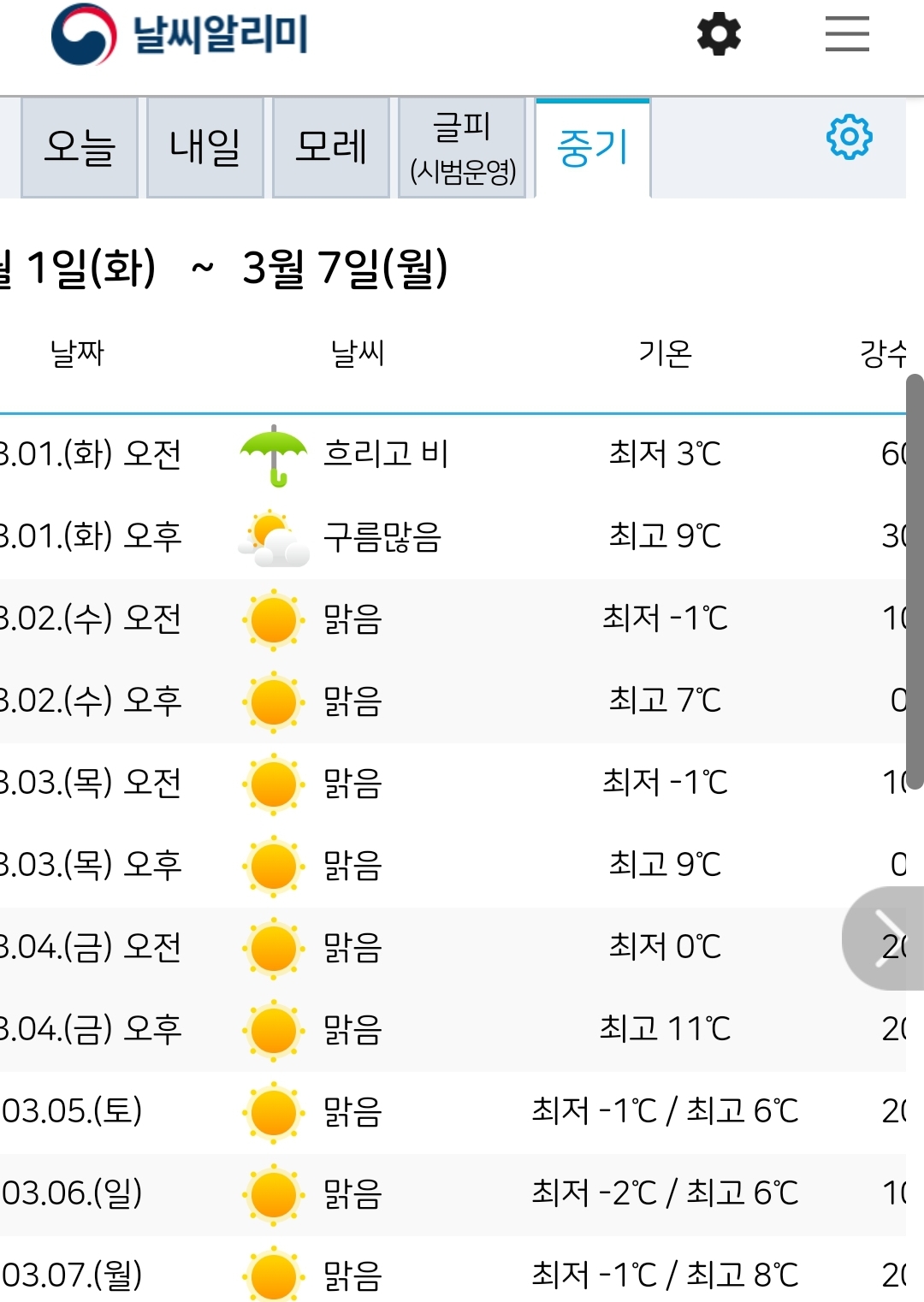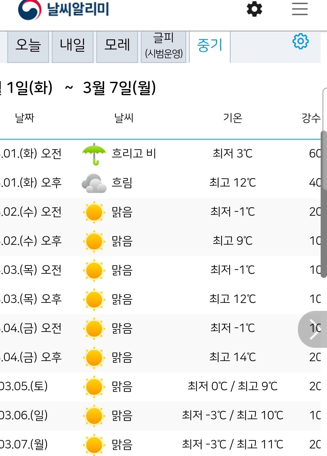 아래 표는 기상청 중기예보입니다. 삼한사온 꽃샘추위느낌이 없지는 않지만 낮최고 영상 14도까지 올라가는 날도 있고, 아침최저는 영하 바로 아래 정도라서, 이런 날이 계속되면 슬슬 땅이 녹겠습니다. 하긴 그 다음이면 3월 중순이니. ㅎㅎ