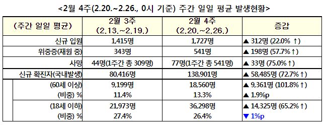 방역 당국 발표… 확진 누적 300만명 임박, 확진 늘자 사망자도 증가 누적 7944명위중증 3일 연속 600명대 가파른 증가세수도권만 9만명…비수도권 첫 7만 넘겨3월 중순 유행 정점 25만명 안팎 예상3