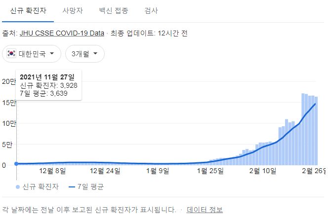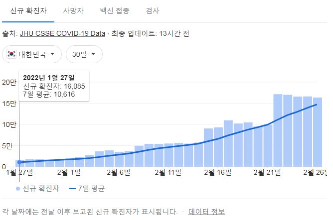 | 코로나19집계(2022.2.27. 0시기준): 163566명 ★ /:/전국 주간 확진자 1백만 (0) | 2022.02.27 |