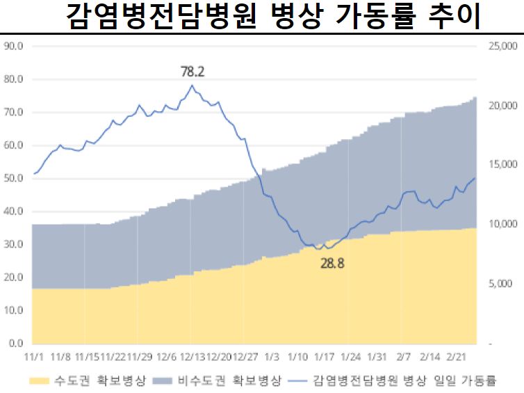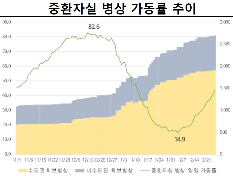 확진자, 중환자실/감염병전담병원 병상 가동률 추이