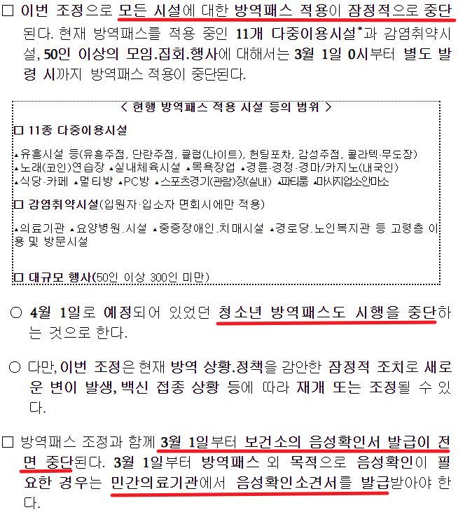 ㅡ 3월 1일부로 모든 시설에 대한 방역패스 의무를 잠정 중단. 4월 1일부로 시행 예정이던 청소년 방역패스도 잠정 취소.