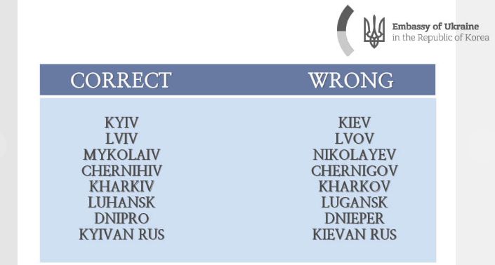키예프는 크이우로, 드네프르는 드니프르로, 리비프는 르비우로, 하르코프는 하르키우로.. 이렇게 보면, KBS가 고친 세 지명(키이우, 르비우, 하르키우)는 제일 중요한 수도 키예프를 우크라이나대사관이 요구한 크이우가 아닌 키이우로 바꿨군. 르비우가 아니라 리비우로.. 국립국어원 자문을 받았나?