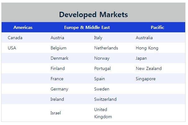 MSCI 선진국(developed countries)지수에 포함된 국가목록은 이렇습니다: