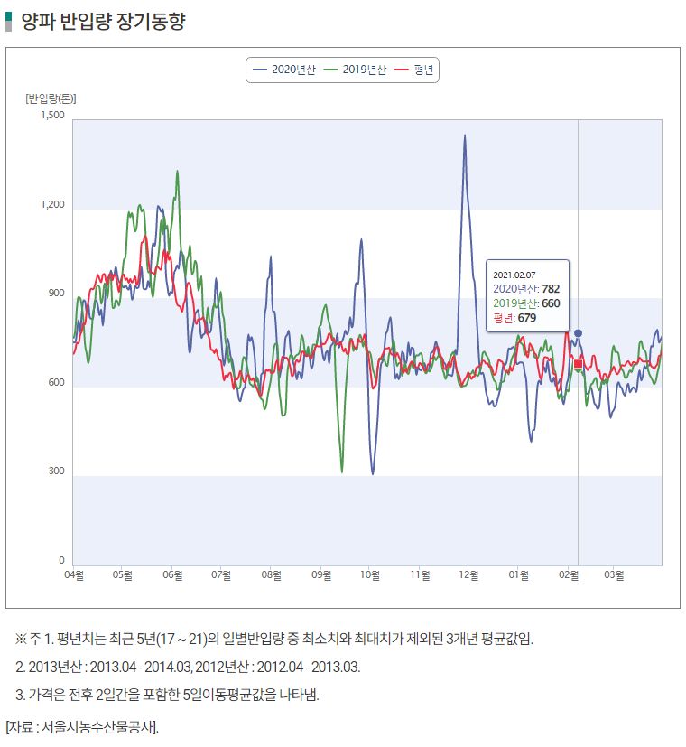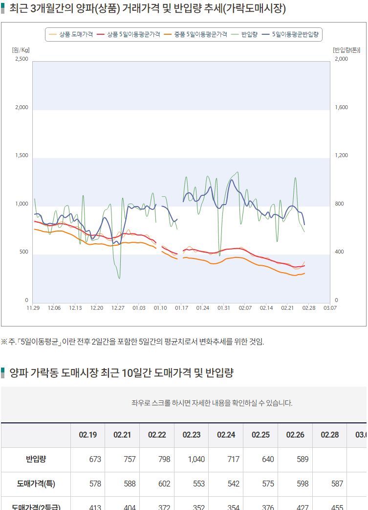 가락도매시장기준 양파 거래가격 및 반입량, 과거치 월별 기록.