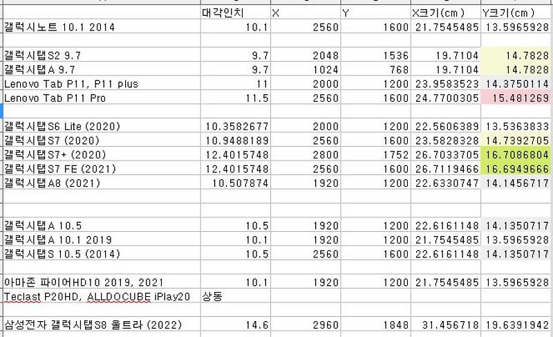 10인치대 태블릿 몇 종류의 화면크기 계산 스크린샷 본문