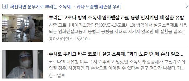 코로나19 대유행 이후 수시로 뿌리고 발랐던 소독제와 살균제가 호흡기로 유입될 경우, 치명적인 폐 손상으로 이어질 수 있다는 연구 결과가 나왔다. 가습기 살균제 사망사건 당시 원인 물질 중 하나로 꼽혔던 '염화벤잘코늄'이 여전히 여러 소독제에서 광범위하게 다용량으로 사용되고 있어서다.(......) 손 소독제나 코 세정제, 점안제, 방부제, 보존제, 항균 티슈, 바닥 청소제 등 다양한 살균·소독용 생활용품에 사용되는 염화벤잘코늄에 호흡기 독성이 있다는 점이 확인된 것이다. 이 물질은 일부 가습기 살균제 제품과 항공방제용 소독제 등에도 활용된 것으로 알려졌다.