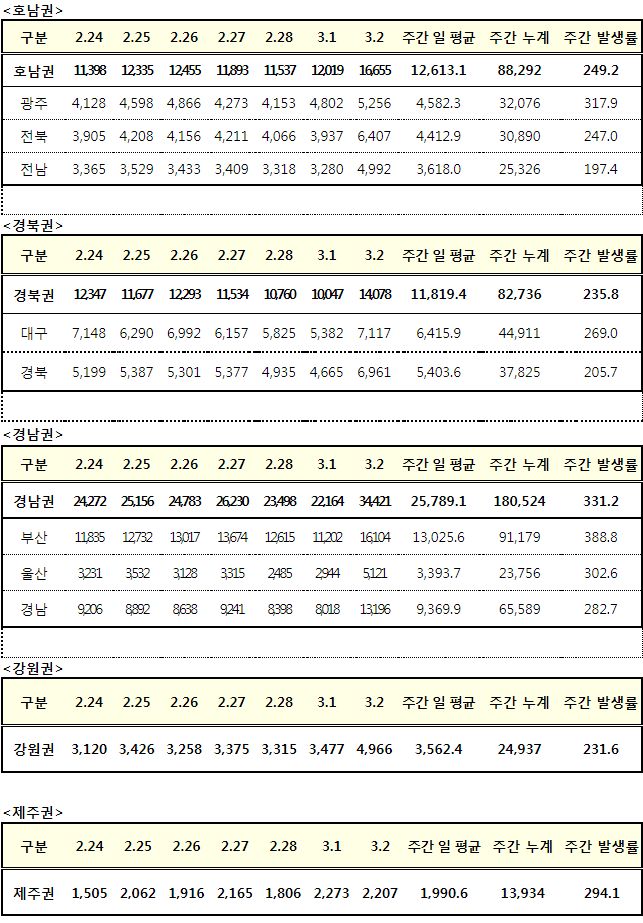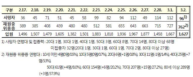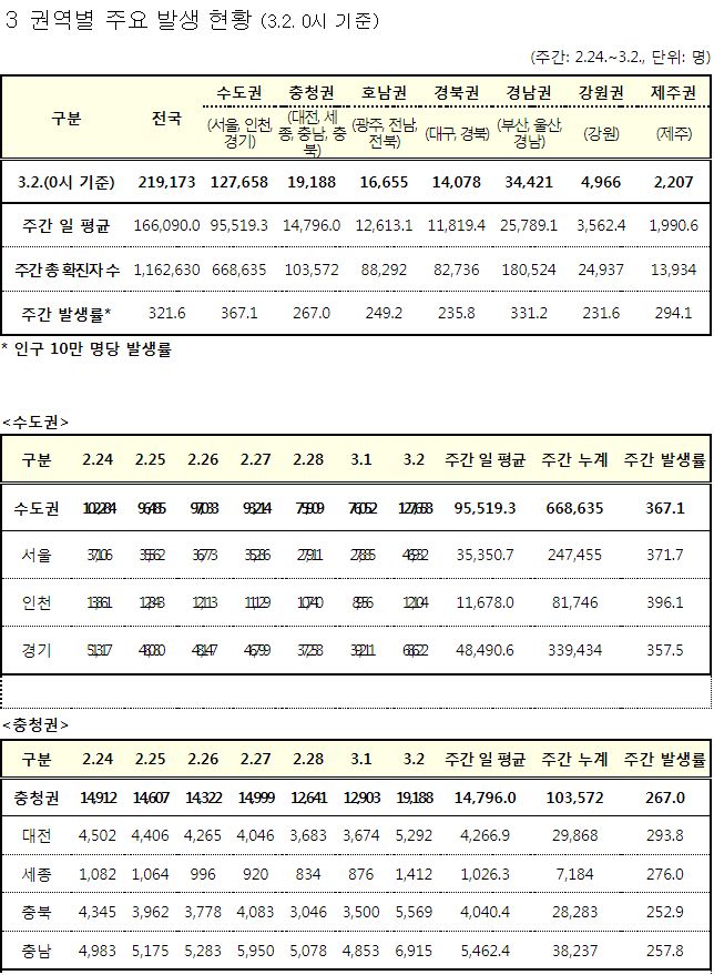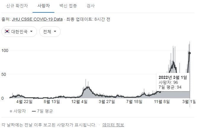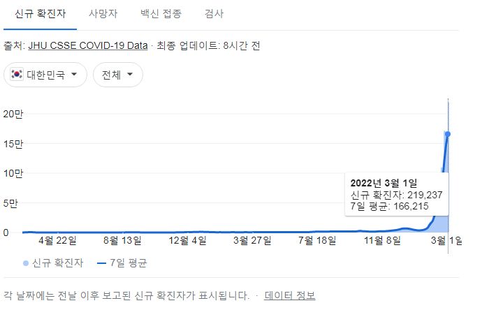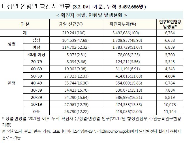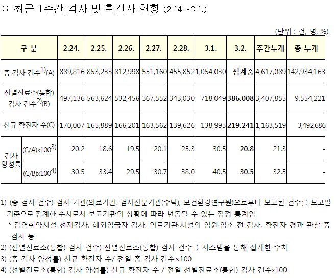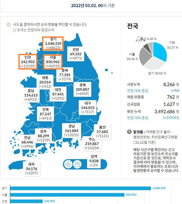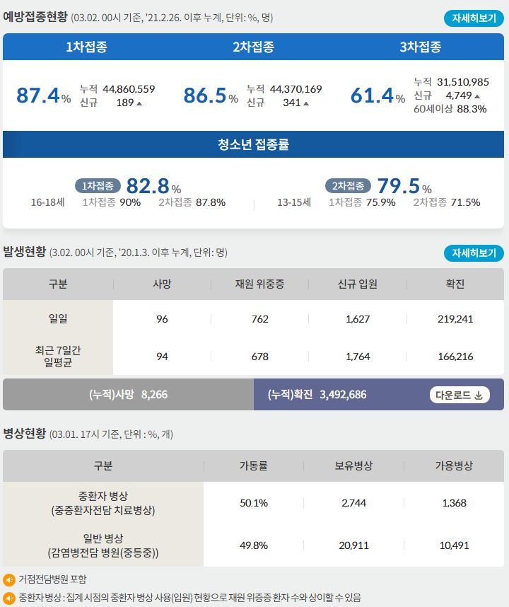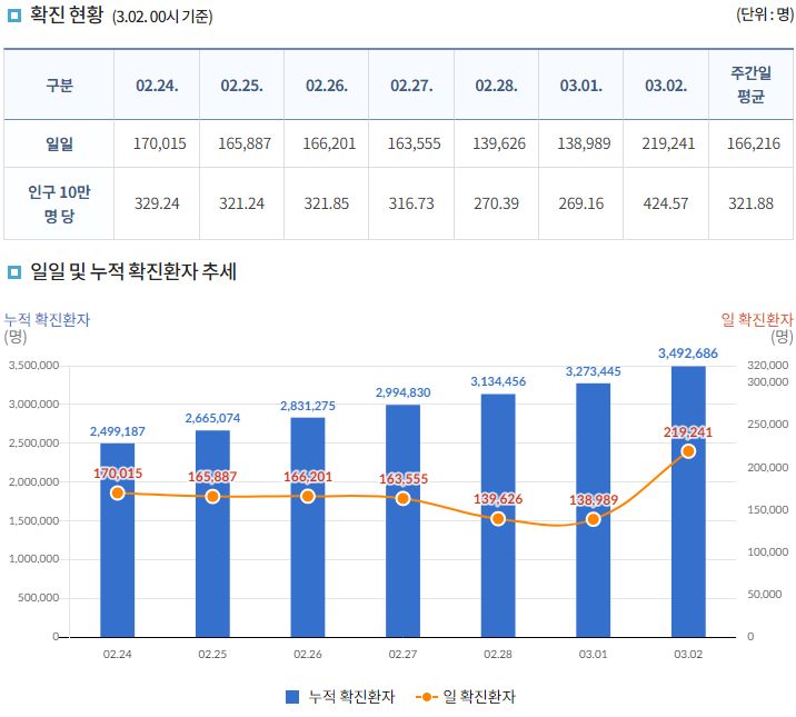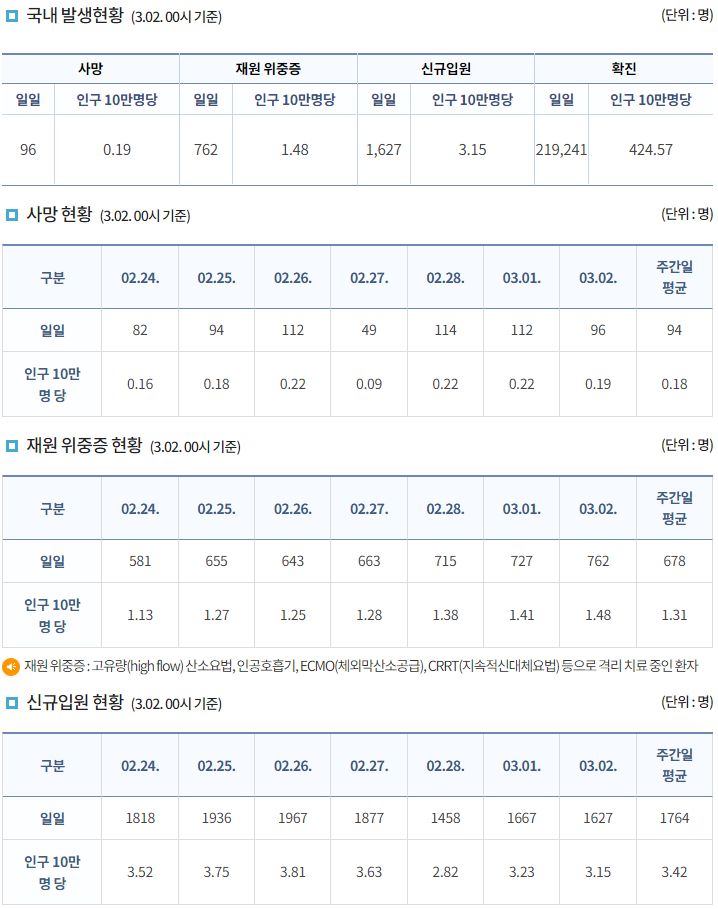 코로나19집계(2022.3.2. 0시기준): 219241명 (일일현황 사망자 96명, 재택치료 82만 명) 본문