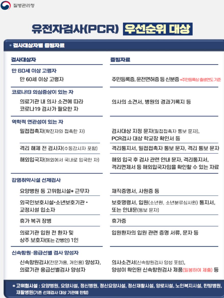 유전자검사(PCR) 우선순위대상: 보건소 등 선별진료소와 임시선별검사소