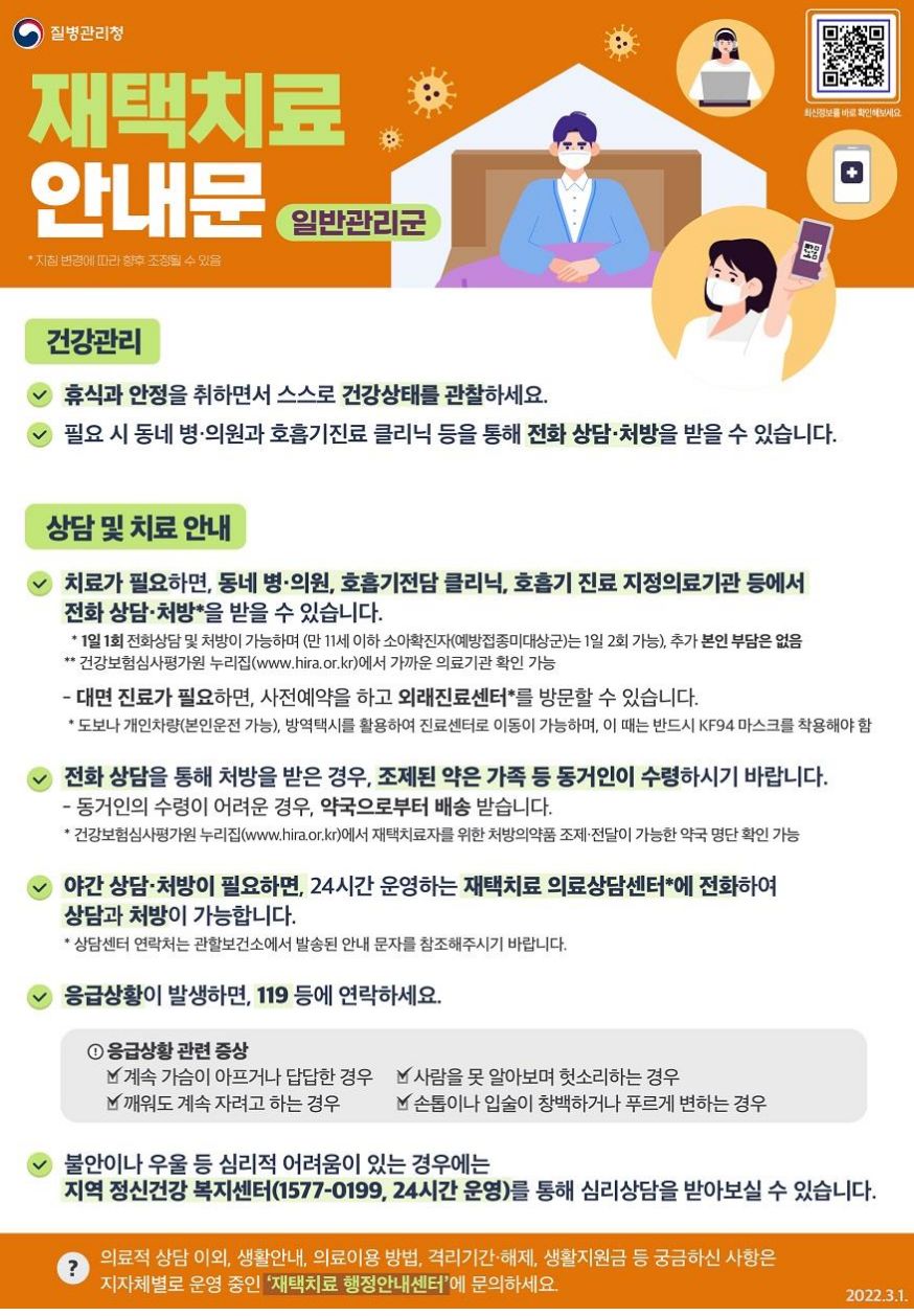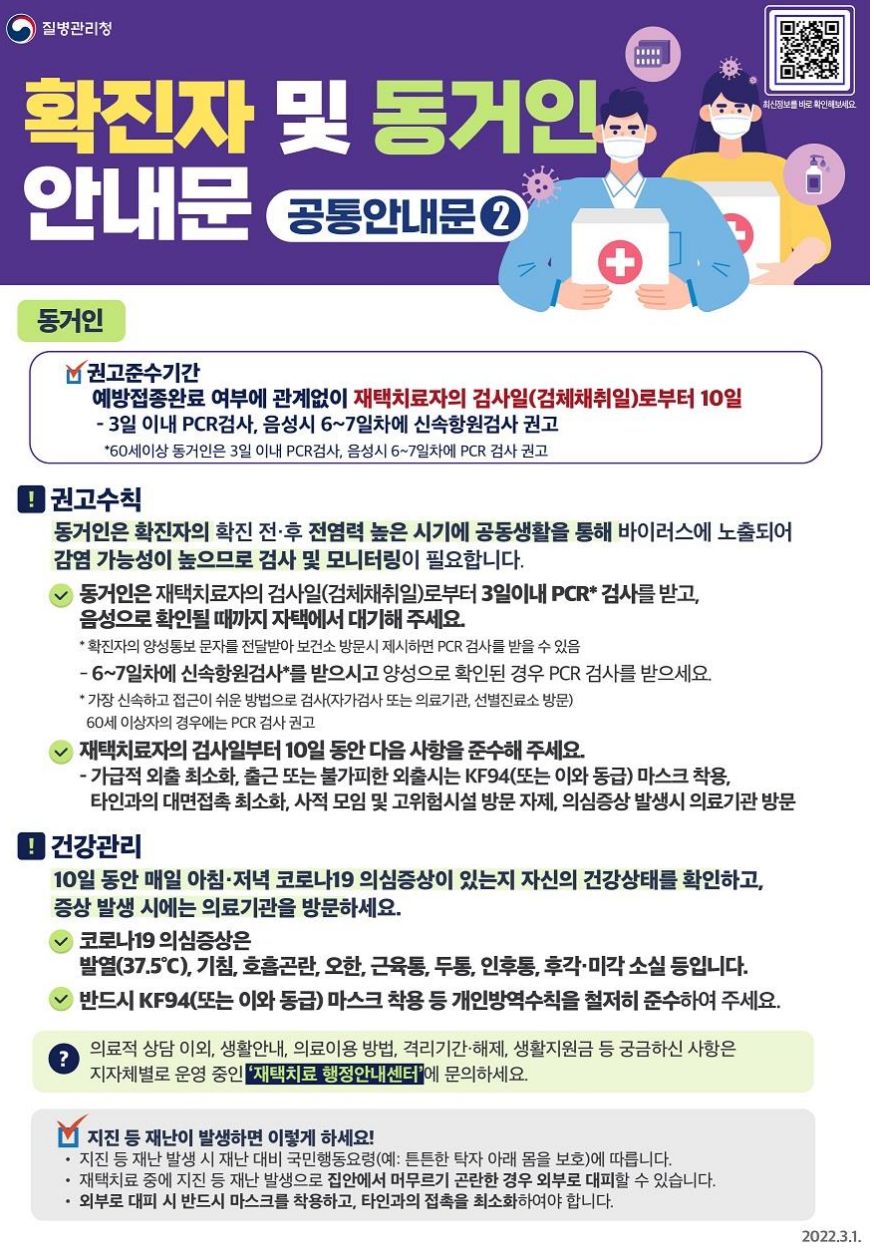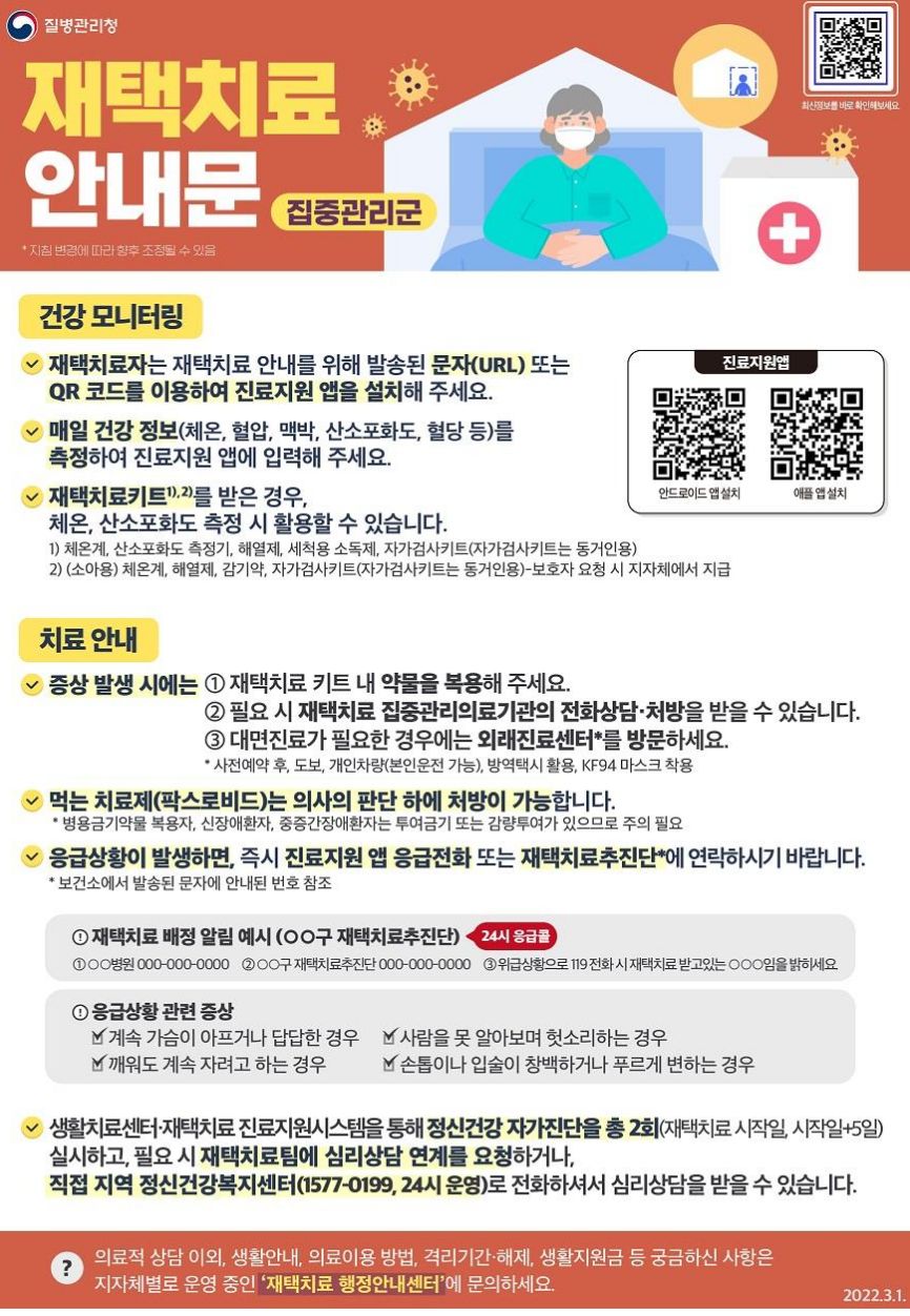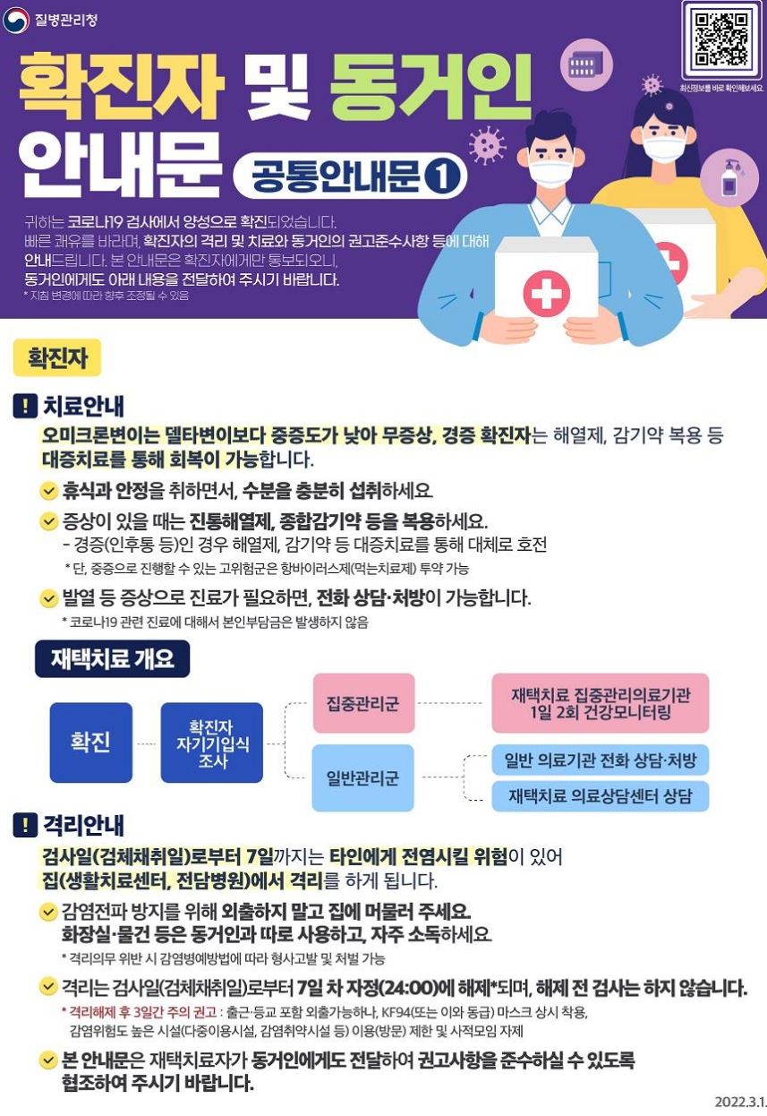 코로나19, 2022.3.1 개정판: 확진자 및 접촉자 관리기준, 재택치료안내, 확진자 및 동거인 안내 등 본문