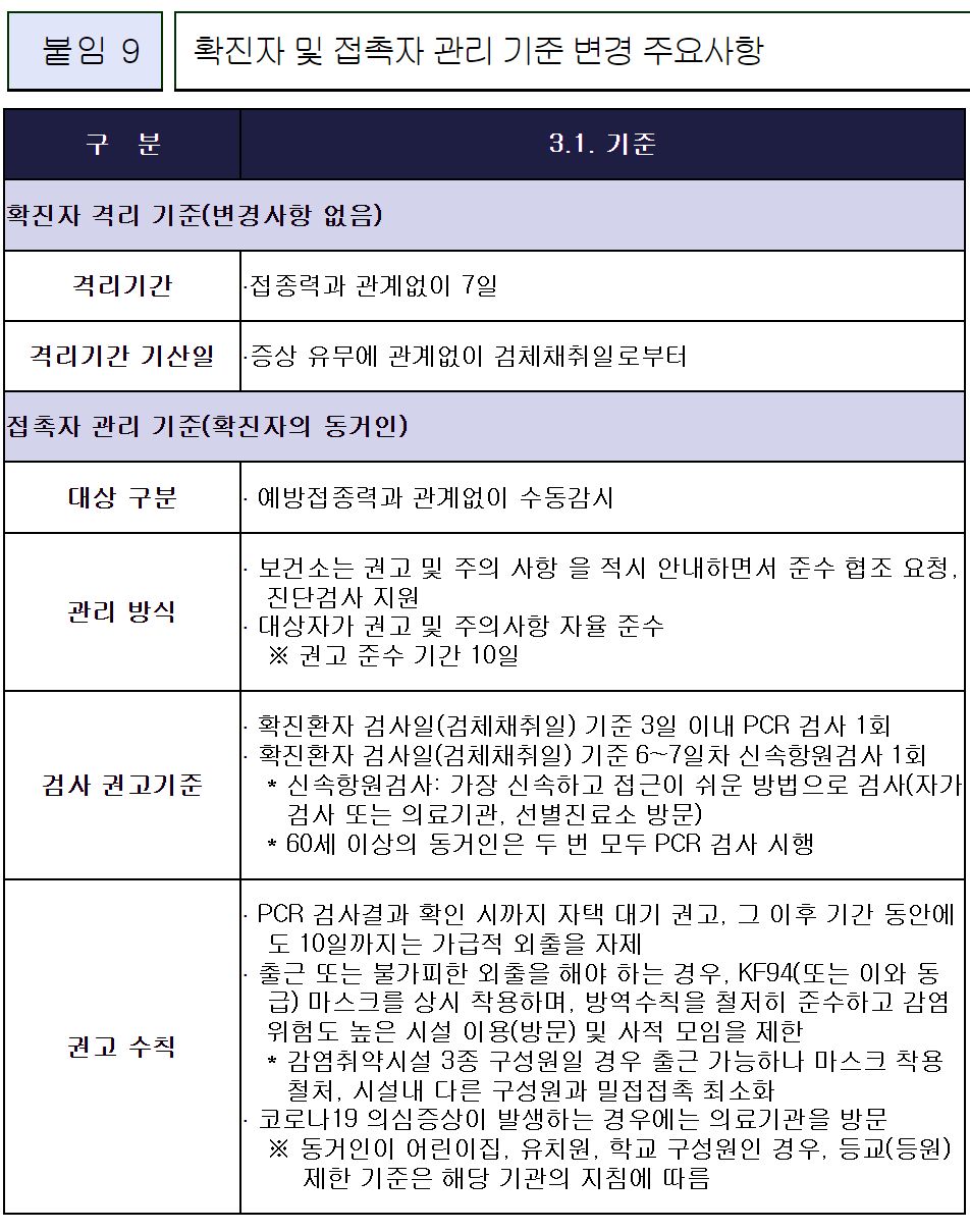 확진자 및 접촉자 관리 기준 변경 주요사항