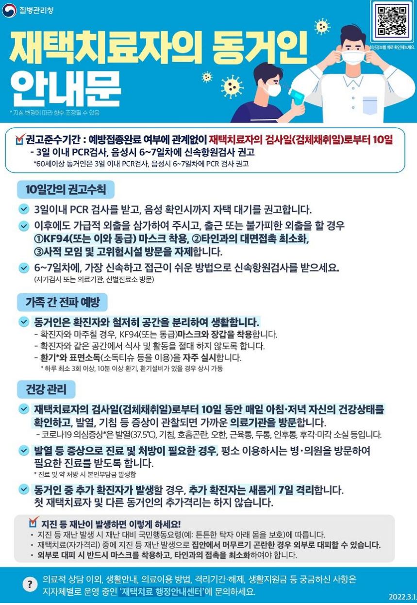 코로나19, 2022.3.1 개정판: 확진자 및 접촉자 관리기준, 재택치료안내, 확진자 및 동거인 안내 등 본문