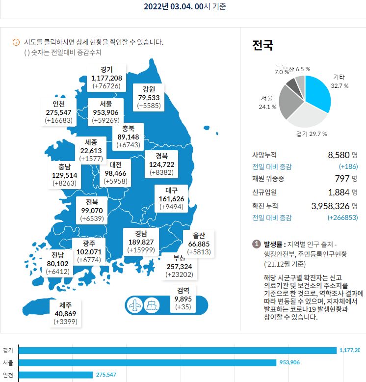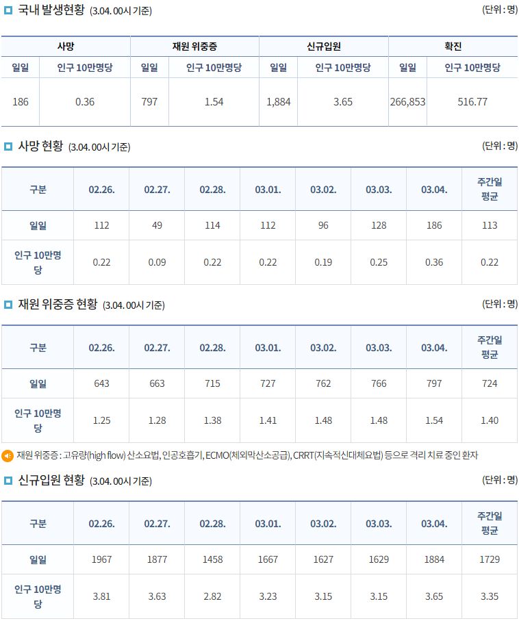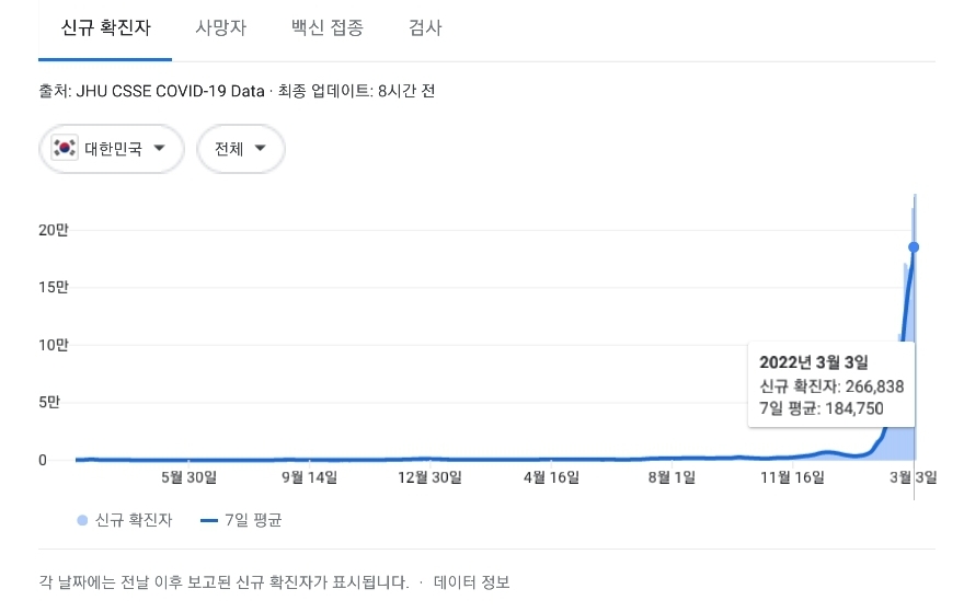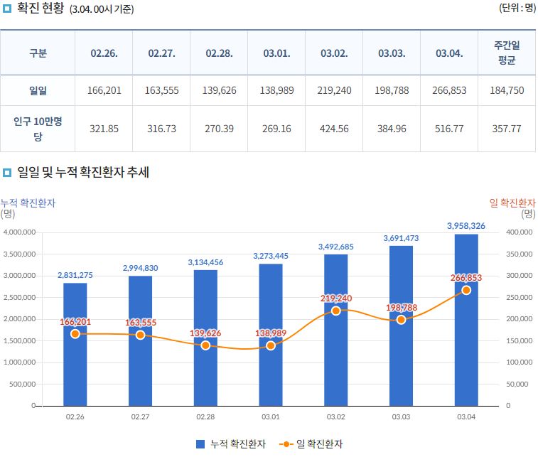 코로나19집계(2022.3.4. 0시기준): 어제 266853명 확진, 186명 사망/:/ 정부예상 3월 중순 하루 26~35만명 내외 발생할 본문