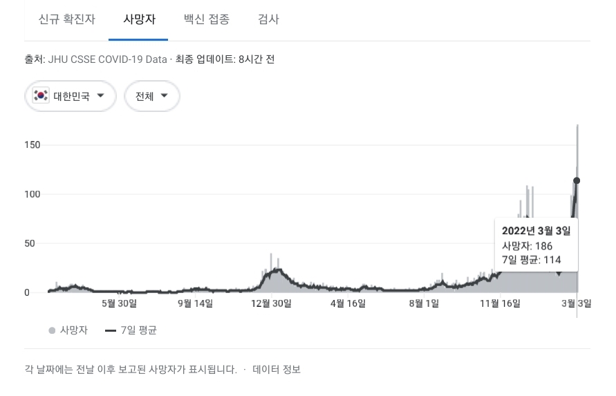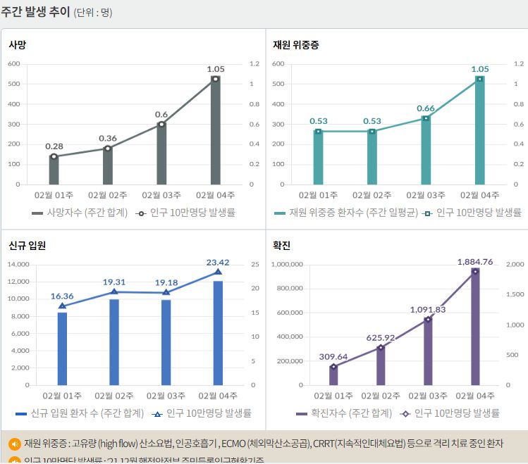 일일사망자수는 계속 늘고 있지만, 신규환자가 크게 늘어난 만큼 치명율이 더 낮으니 괜찮다는 자평. 한편 신규환자가 크게 늘어난 것은 1) 델타대비 오미크론변이의 상대적인 고병원성, 2) 거리두기 완화의 결과(작년 유행때 거리두기를 강화하자 확진자수가 확 줄어든 예가 있다)로 생각할 수 있는데, 다른 편에서는 곧 3년째로 접어드는 거리두기를 언제까지 끌 수 없다는 정치경제사회분야의 동기.