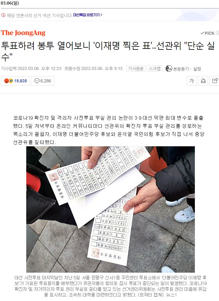 코로나19 확진자 및 격리자 사전투표 부실 관리 논란이 3·9 대선 막판 최대 변수로 돌출했다. 5일 저녁부터 온라인 커뮤니티마다 선관위의 확진자 투표 부실 관리를 성토하는 목소리가 들끓자,