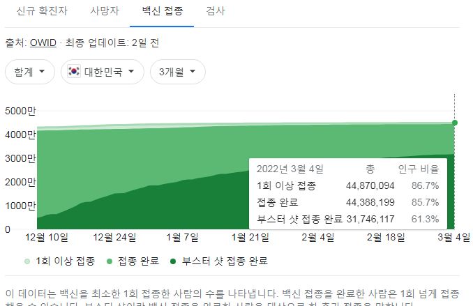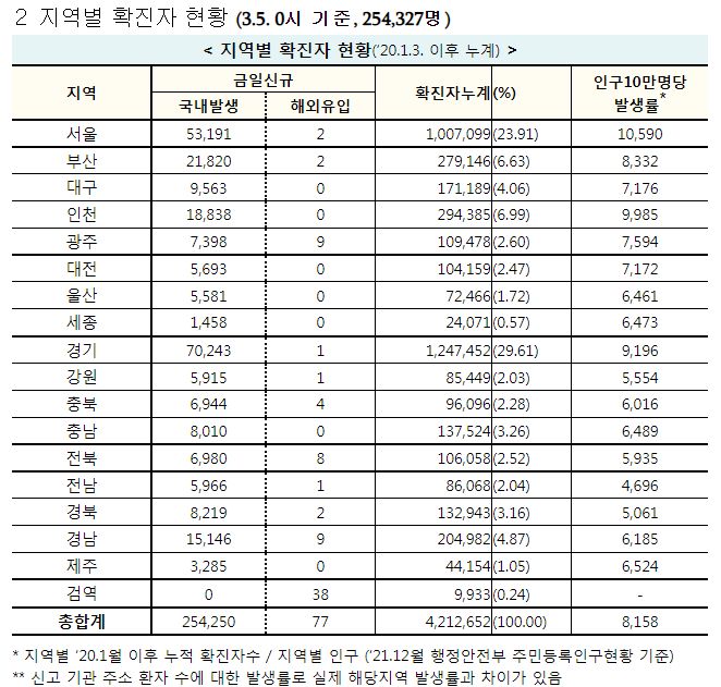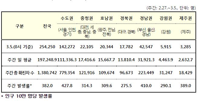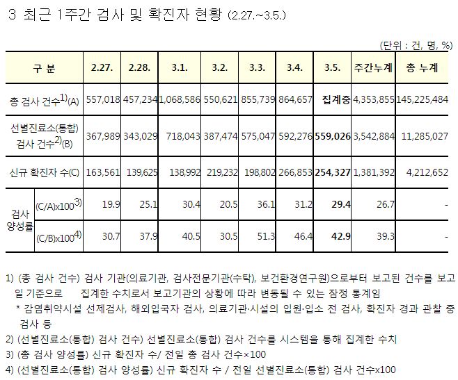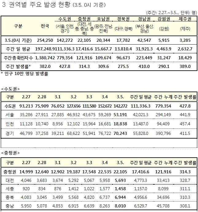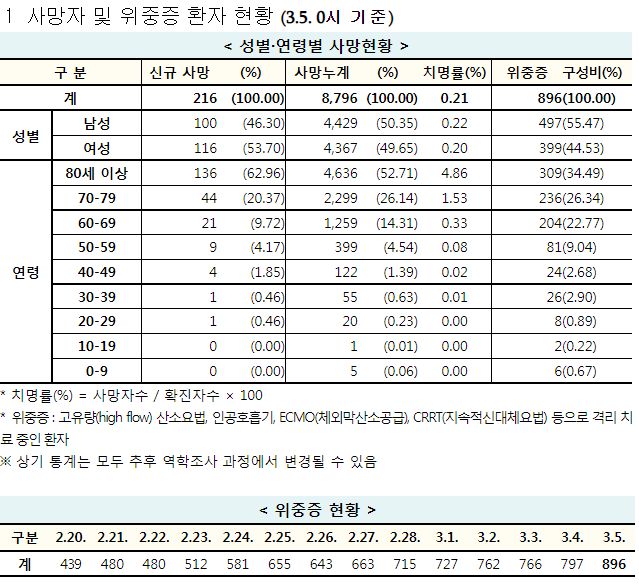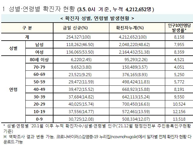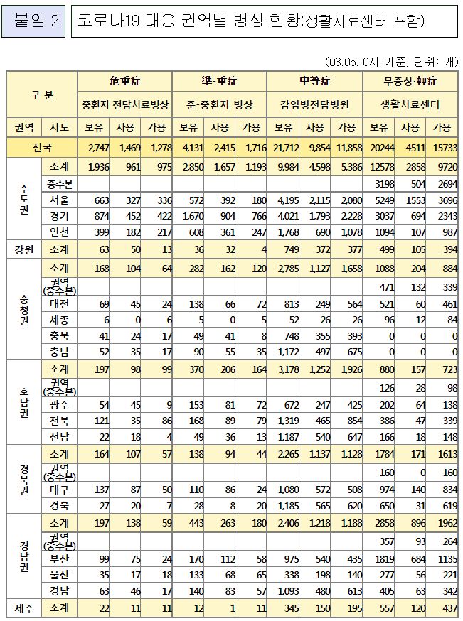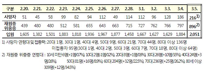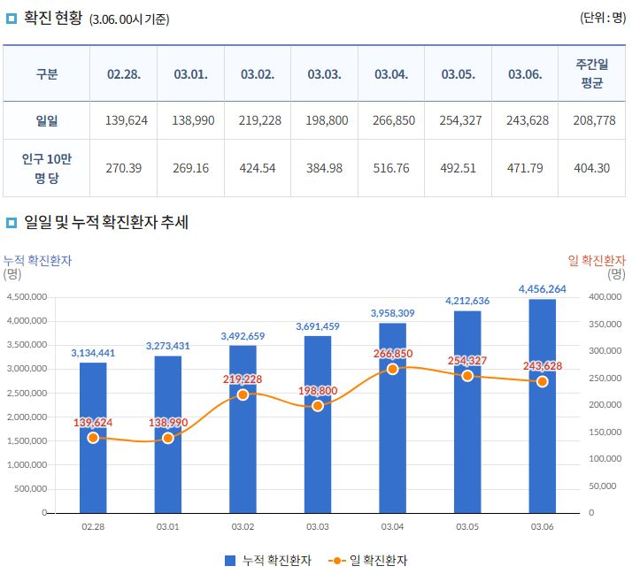 코로나19집계(2022.3.5. 0시기준): 일일신규(확진자 25만, 사망자 216명), 병상가동률 여유있음, 재택치료 102만(집중관리군 16만) 본문
