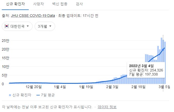 | 코로나19집계(2022.3.4. 0시기준): 어제 266853명 확진, 186명 사망/:/ 정부예상 3월 중순 하루 26~35만명 내외 발생할 (0) | 2022.03.04 |