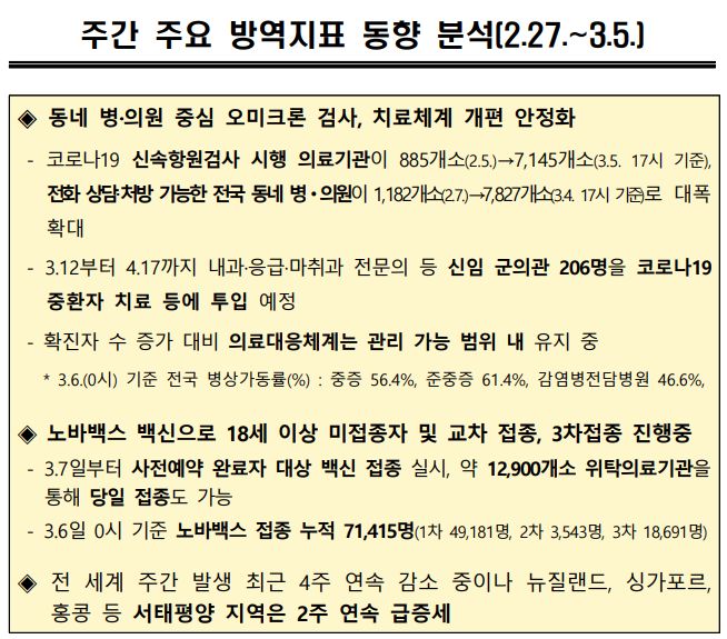 질병관리청: 주간 주요 방역지표 동향 분석(2.27.~3.5.)