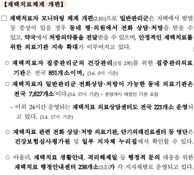 재택치료는 집중관리군(감염자로서 병이 빠르게 악화될 수 있거나 지금까지의 집계로 치명률이 높다고 알려진 사람들. 노인, 기저질환자, 미접종자 등)과 일반관리군(고령자가 아닌 일반 성인으로서 집중관리군이 아닌 사람들 등)으로 나뉘어있습니다. 일반관리군은 처방받은 약이나 대증요법으로 권장되는 약먹고 자가격리, 자가치료하는데 몸상태가 나빠지면 지역 담당센터에 전화걸어 상담하게 됩니다(집중관리군, 입원 등). 그게 아니라 무증상인 채로 시간이 지나거나 경증인 채로 있다가 회복되고 기일이 되면 PCR검사받아 음성되면 나은 것입니다. 생각나는 대로 적으면 대략 그런데 이것은 자세한 지시내용이 들어간 홍보자료 포스터가 보도자료 뒤에 붙어있으니까 참고하세요.