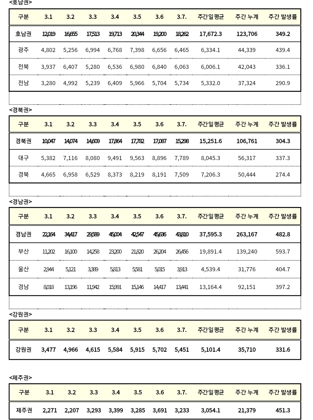 예상됐듯이 수도권에서 시작해 간선을 타고 인구밀도가 높은 전국 광역시(와 아마도 공단지역)를 중심으로 퍼져가는 모양새같네요. 주요 광역시는 다 지난주 수도권수준으로 환자가 많습니다.