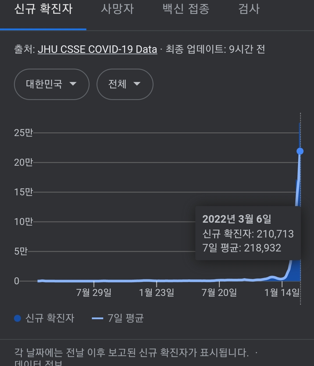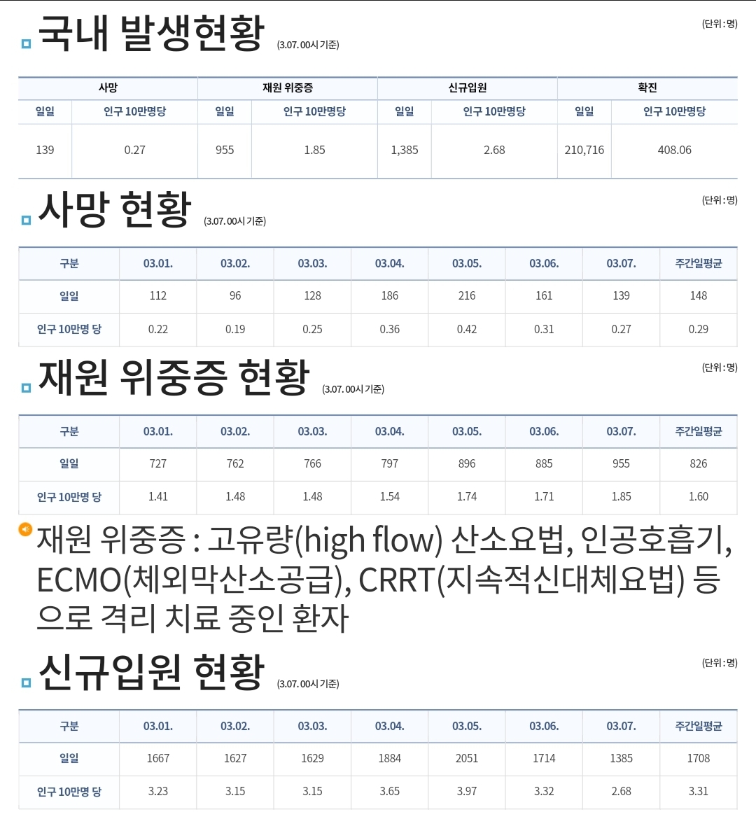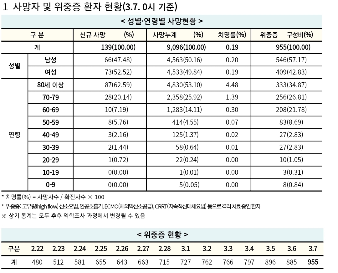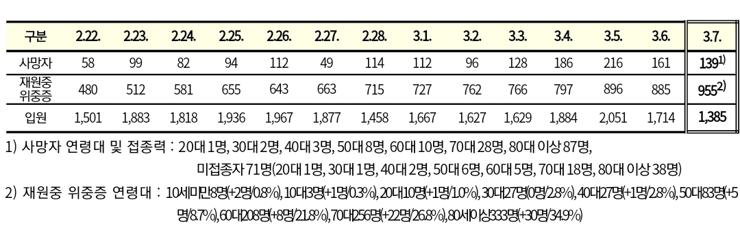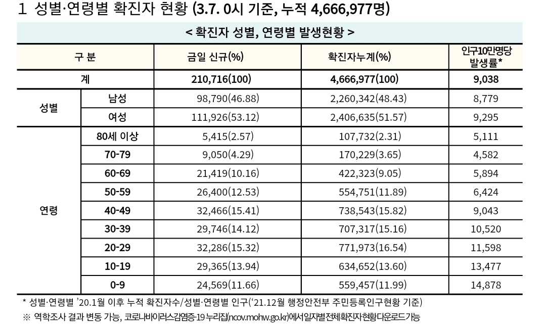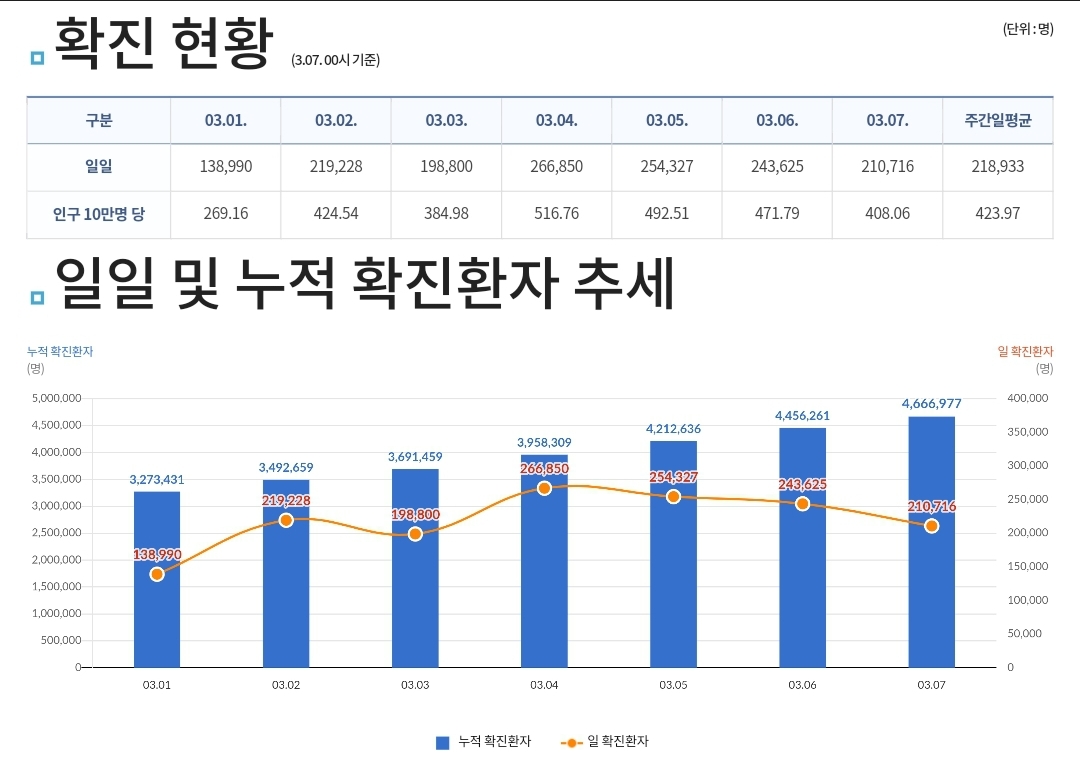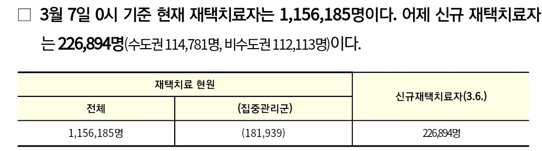 코로나19집계(2022.3.7. 0시기준): 확진 +21.1만, 사망 +139명, 재택치료 116만(집중관리 18.2만), 본문