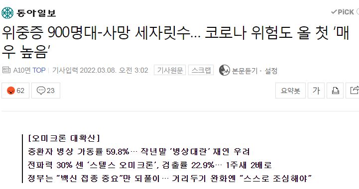 | 코로나19집계(2022.3.8. 0시기준): 확진자 +20.3만, 사망자 +186명, 중환자실 가동률 ~60%, 재택치료 116만(집중 18만) (0) | 2022.03.08 |