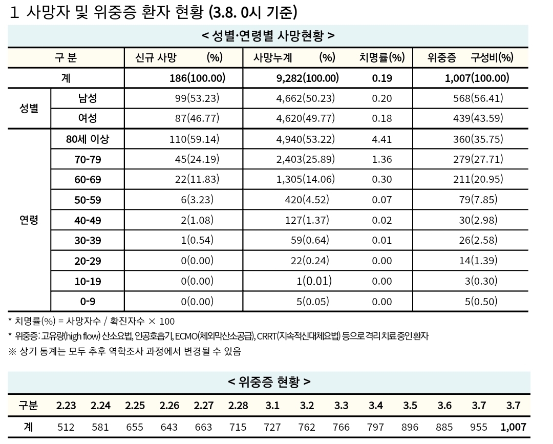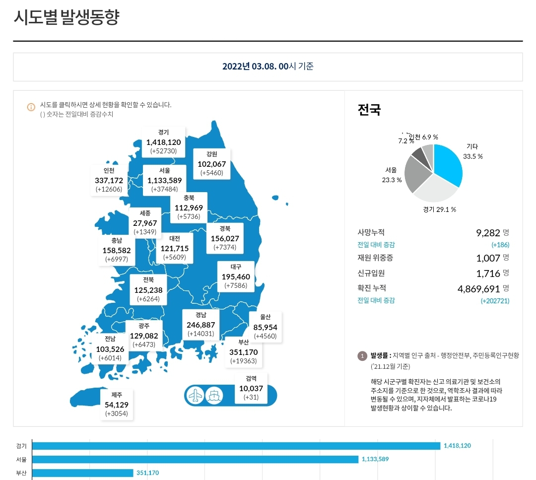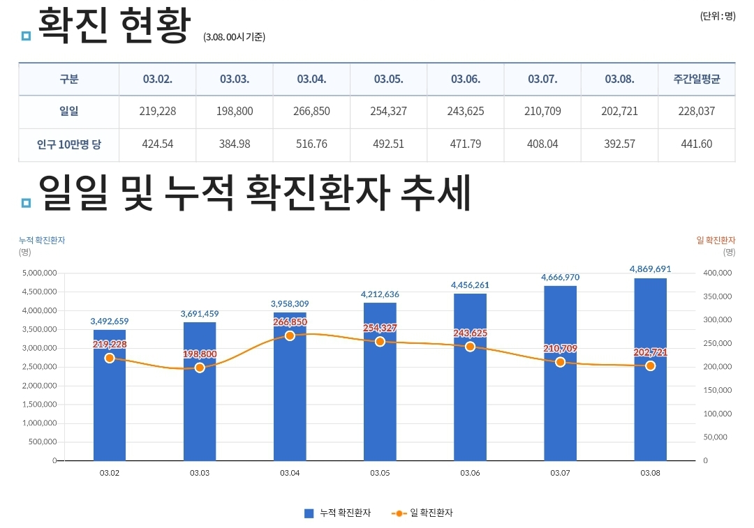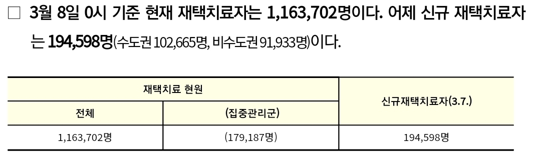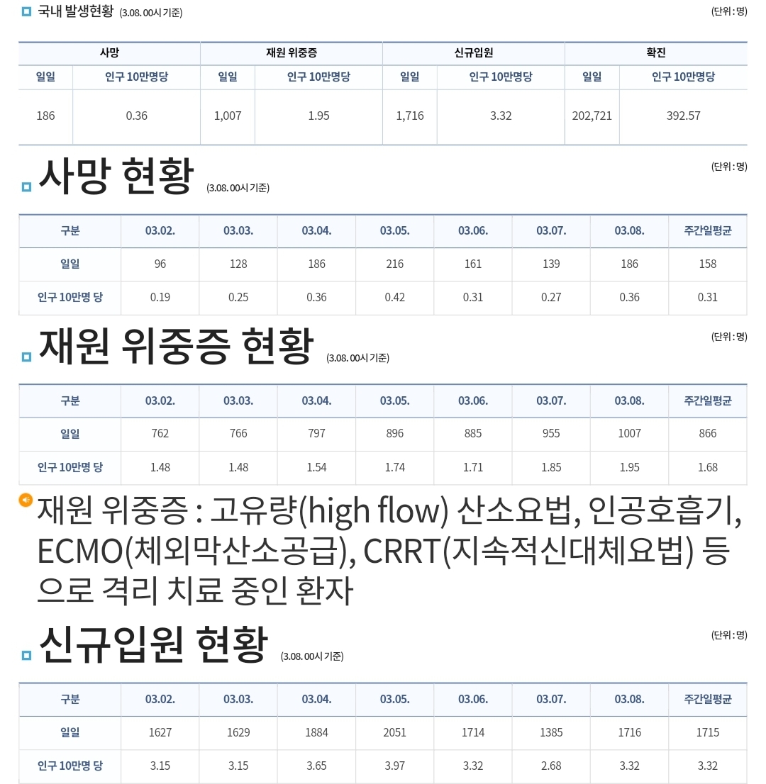 코로나19집계(2022.3.8. 0시기준): 확진자 +20.3만, 사망자 +186명, 중환자실 가동률 ~60%, 재택치료 116만(집중 18만) 본문