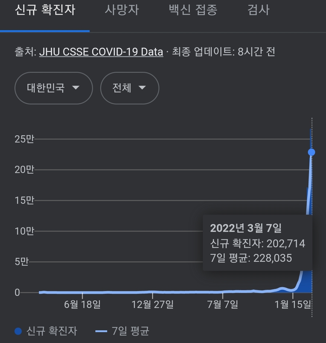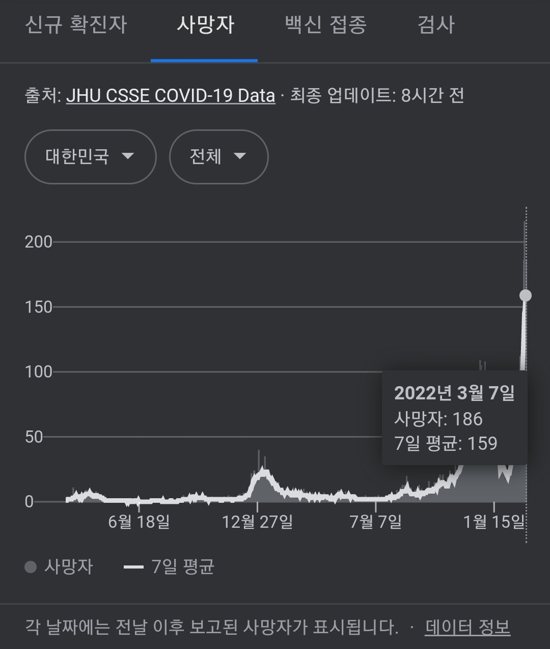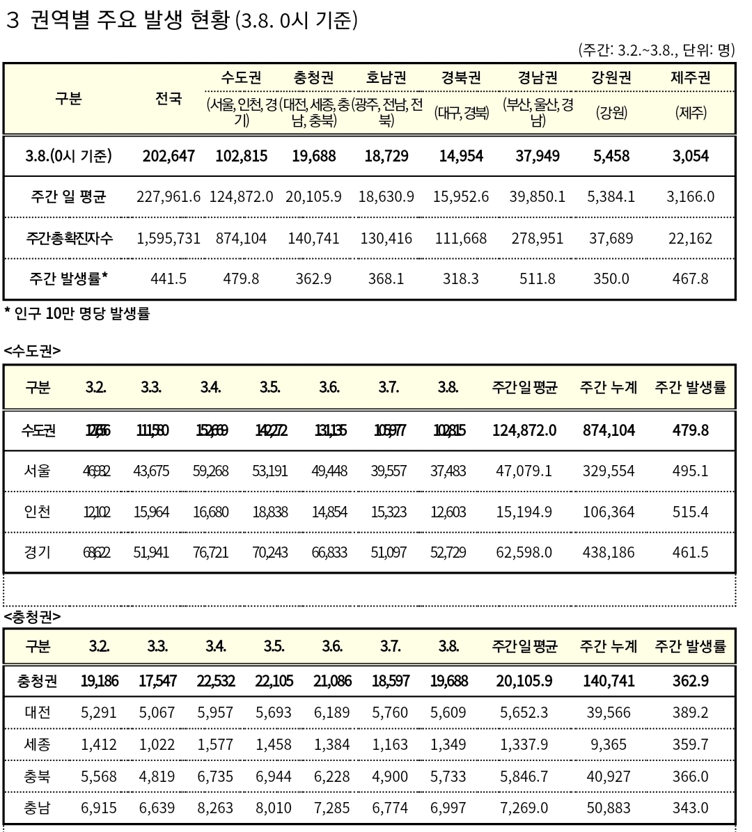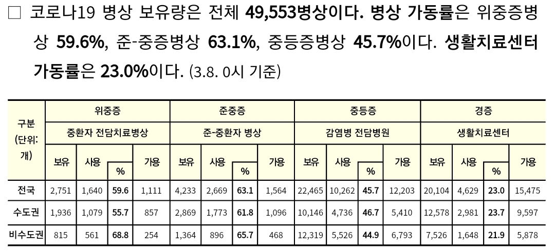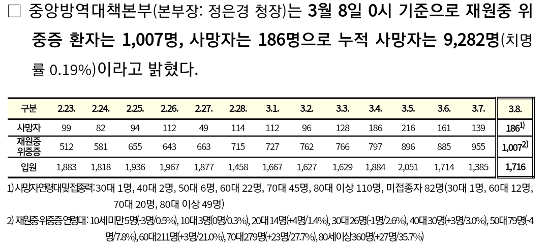 코로나19집계(2022.3.8. 0시기준): 확진자 +20.3만, 사망자 +186명, 중환자실 가동률 ~60%, 재택치료 116만(집중 18만) 본문