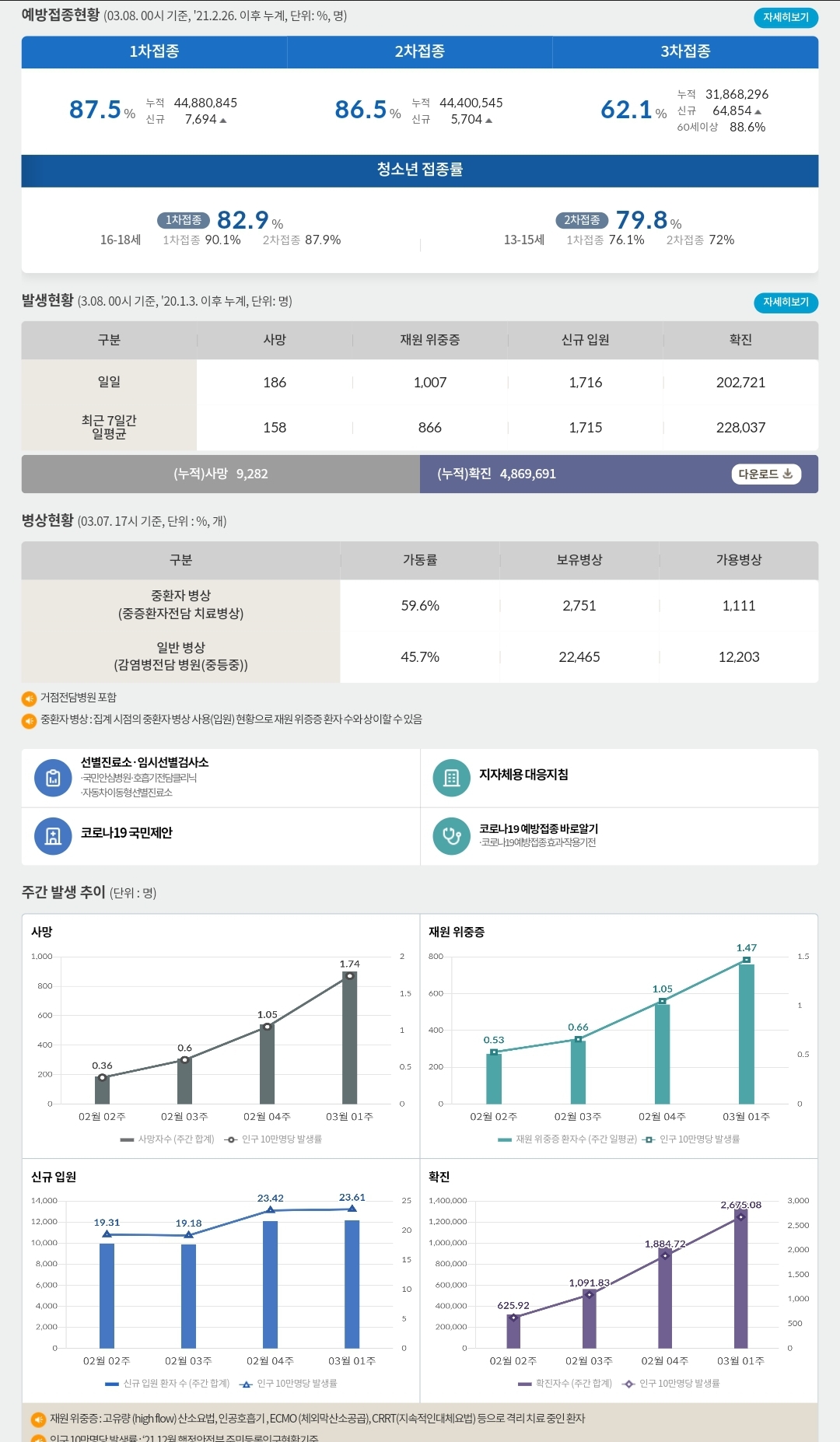 | 코로나19 세부지표: 이동량분석, 병상가동률, 확진자 예방접종이력 등 (0) | 2022.03.08 |