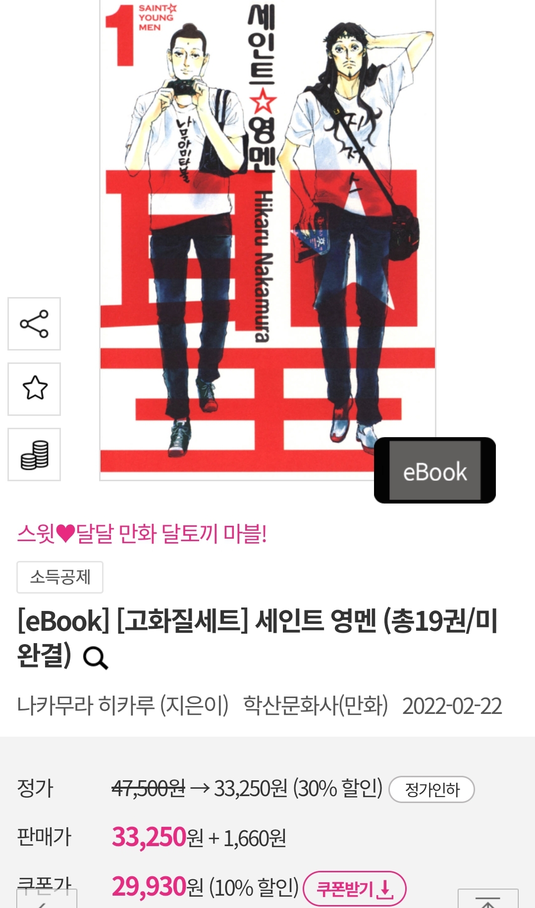 알라딘 세트가격(완결아니고 아직 간행 중입니다)은 권당 1600원 정도네요. 대여판이 아니라 구매판 세일입니다.