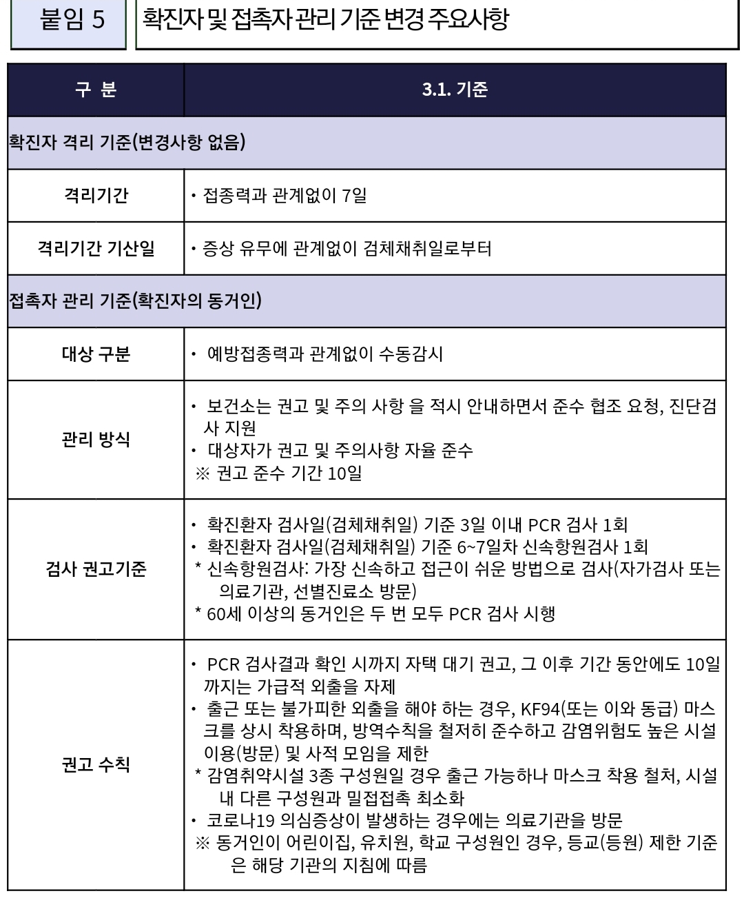 확진자 및 접촉자 관리기준 변경 주요사항