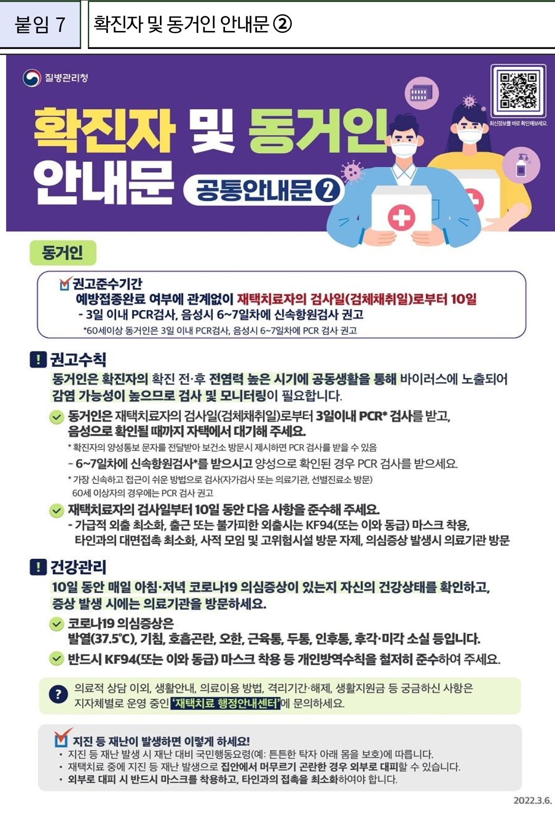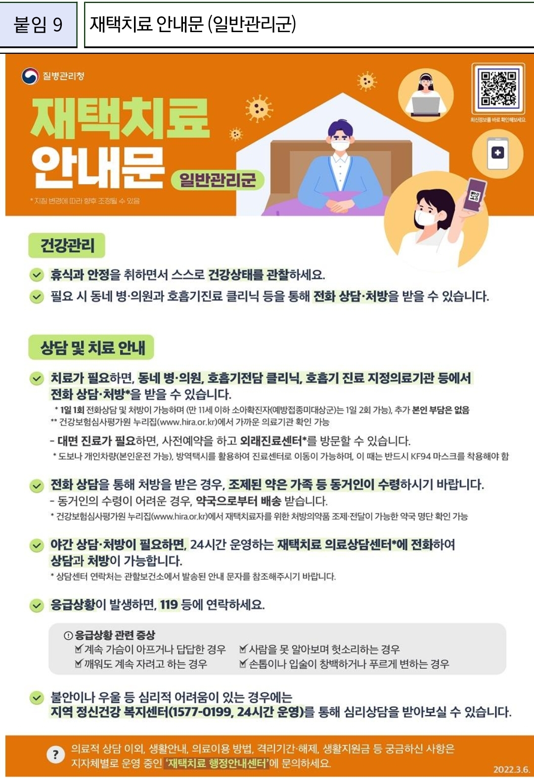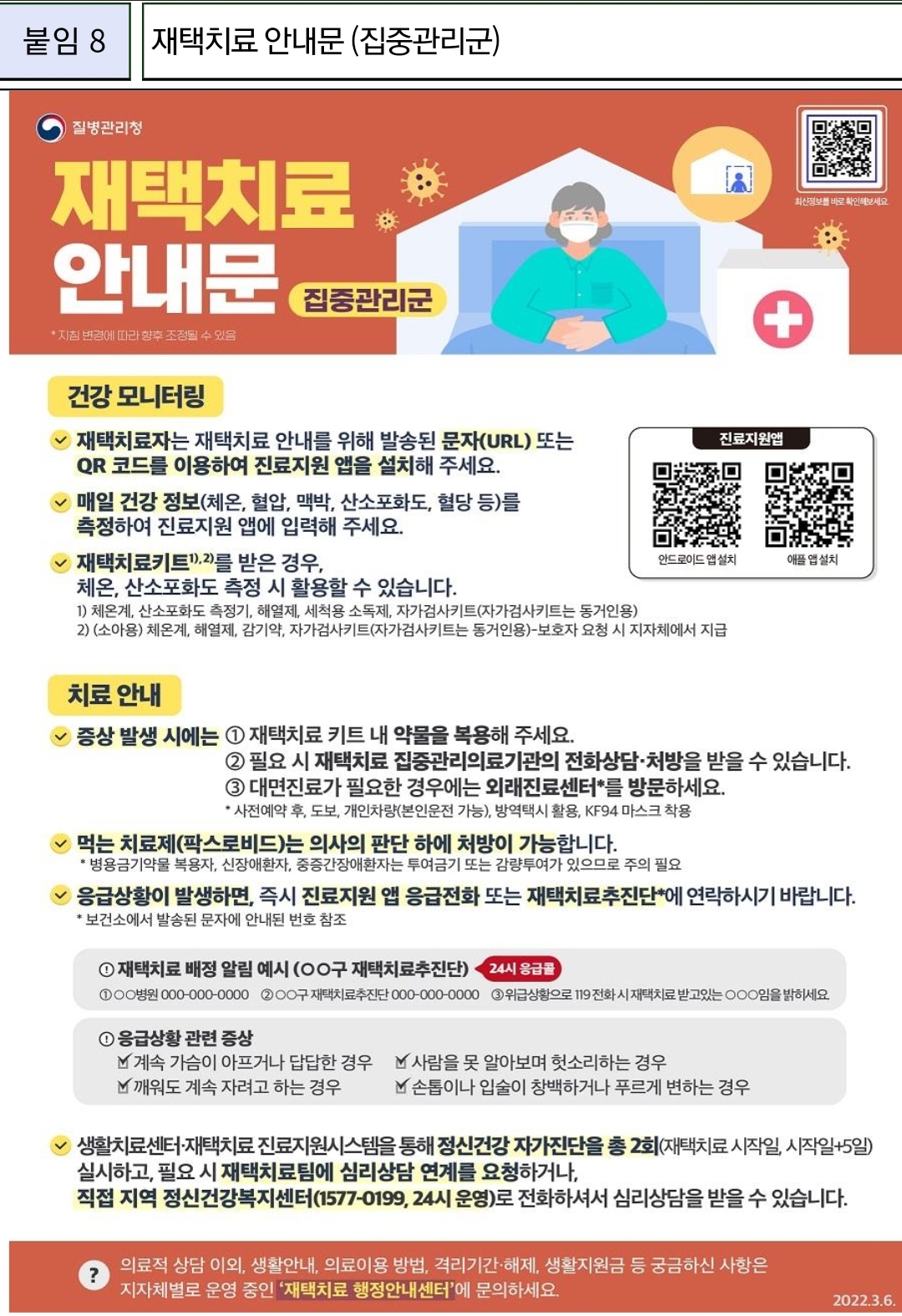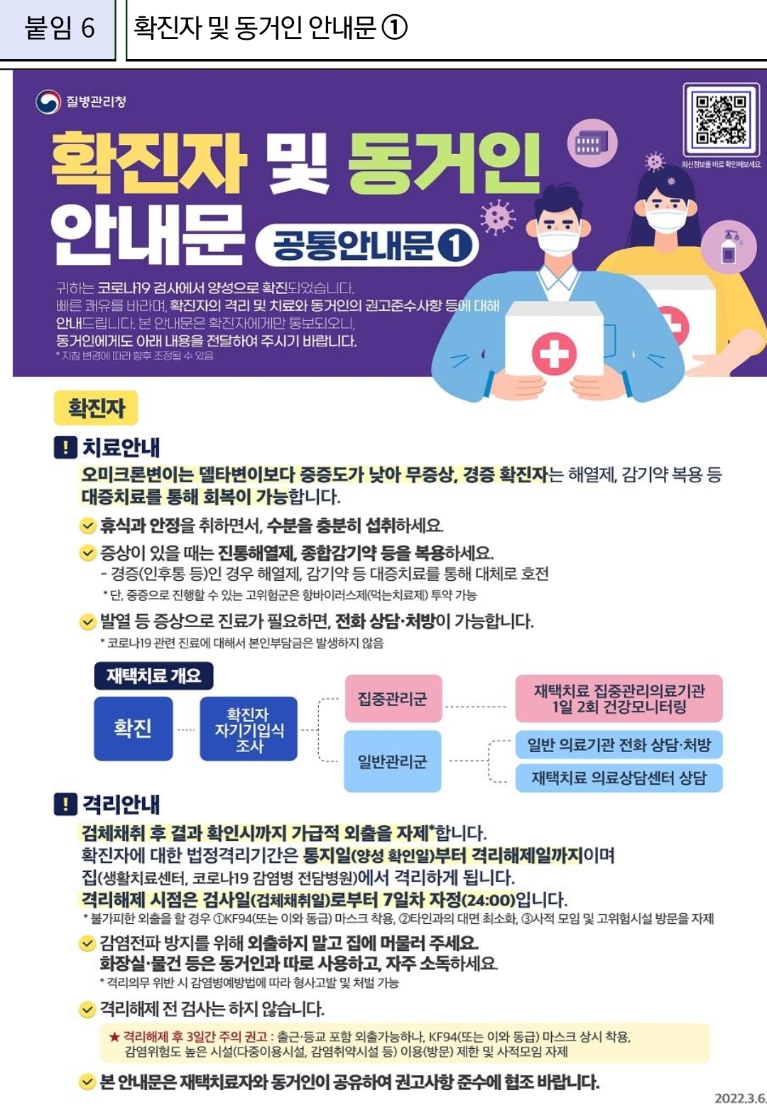 | 코로나19, 확진자 가이드: 소아 재택치료 안내/:/임산부 분만 안내(2022.3.8) (0) | 2022.03.08 |