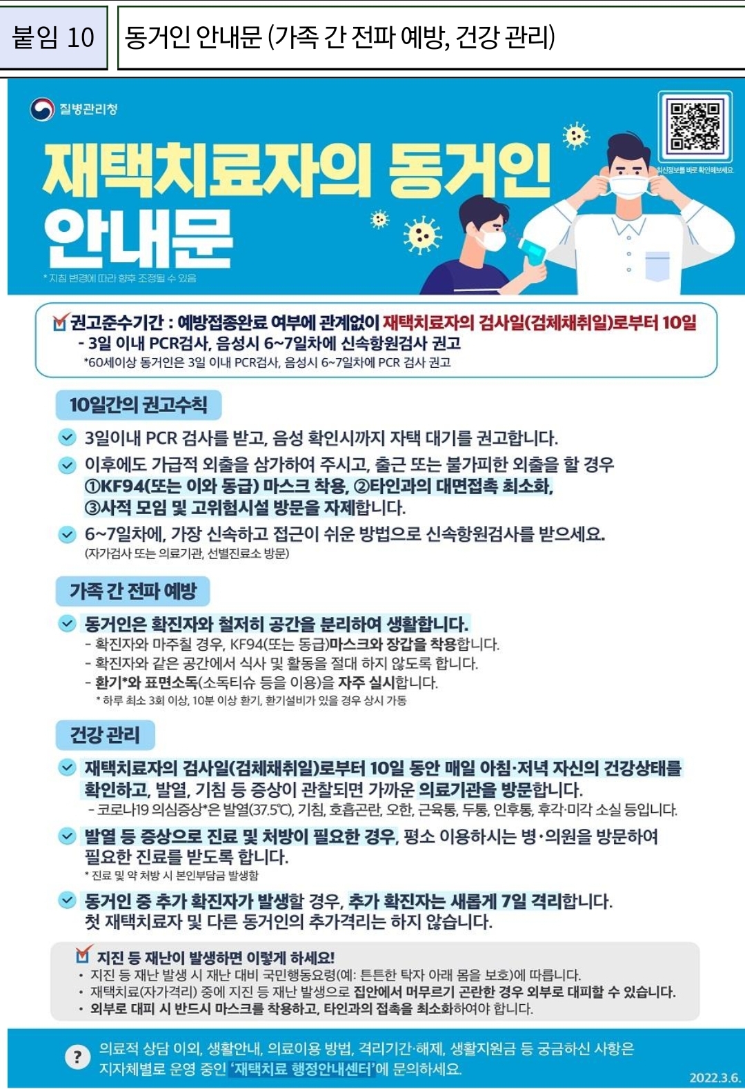 동거인 안내문(가족 간 전파 예방, 건강 관리)
