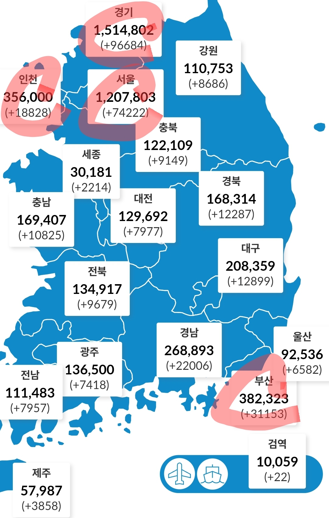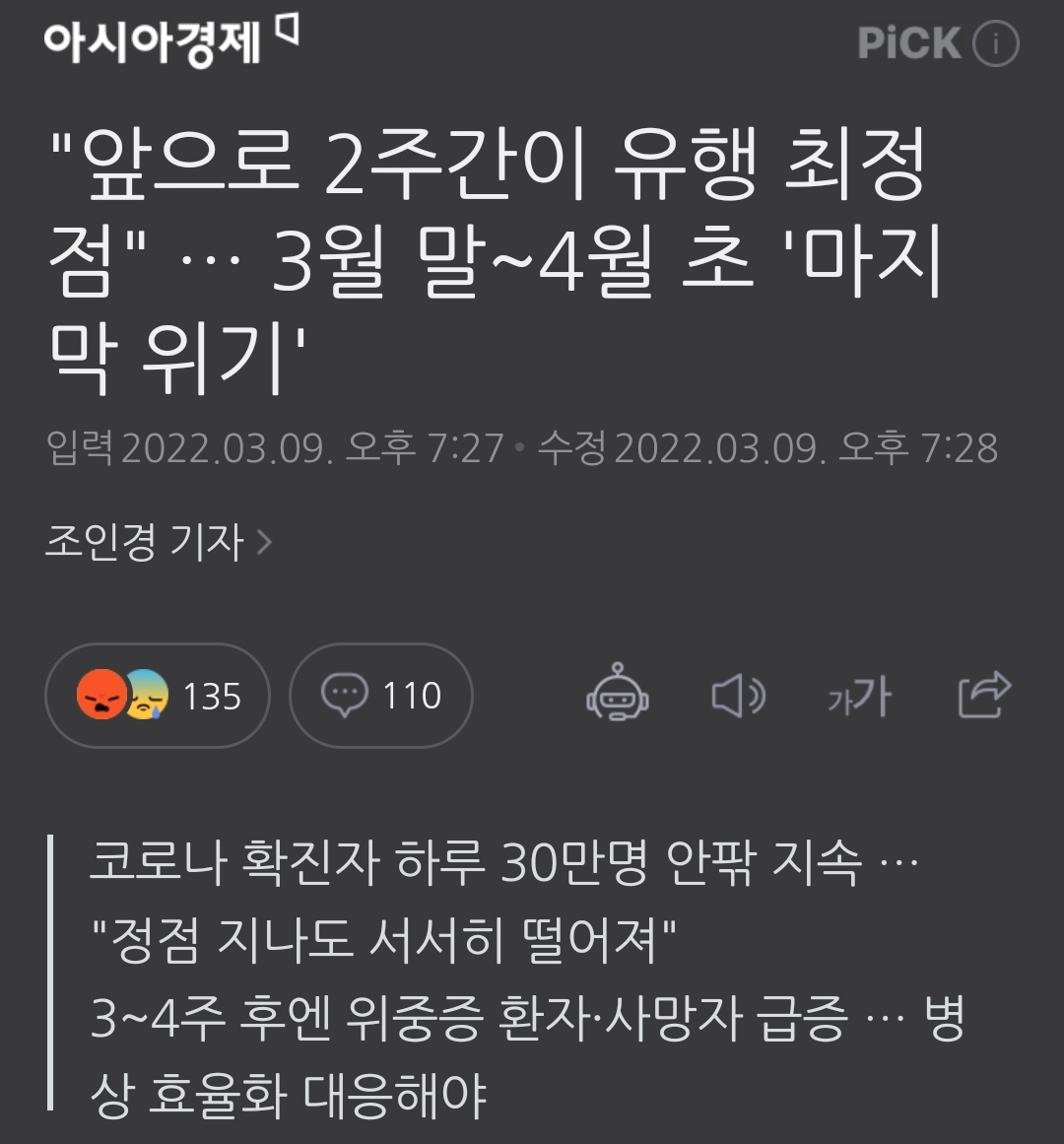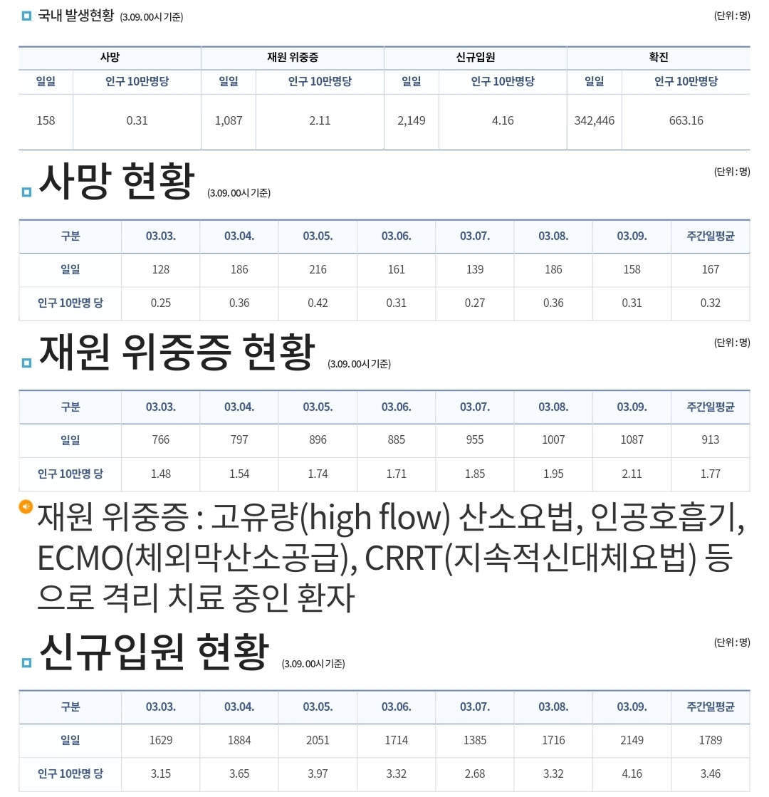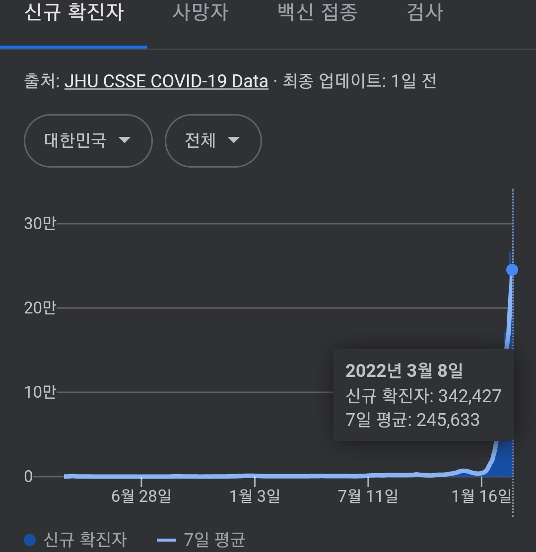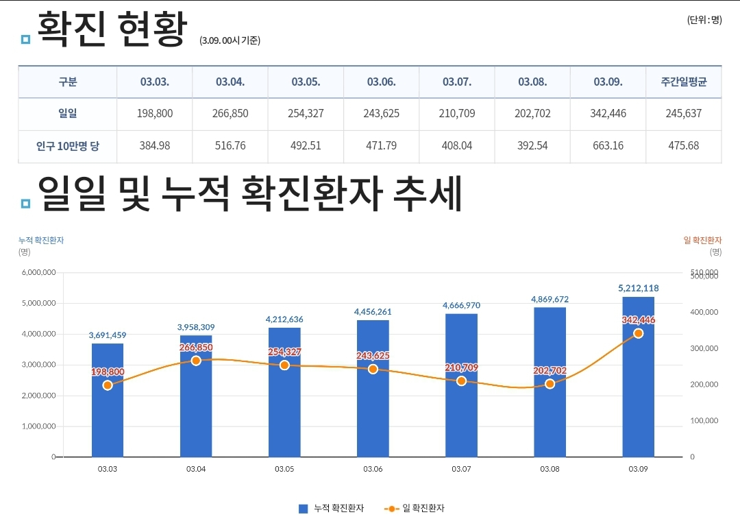 코로나19집계(2022.3.9. 0시기준): 확진자 +34.2만, 사망다+158명/:/앞으로 1-2주 동안 일 30만 이상 피크 전망 본문