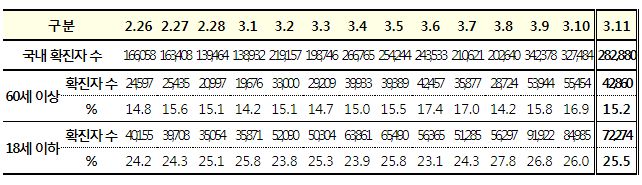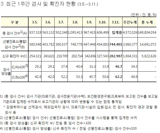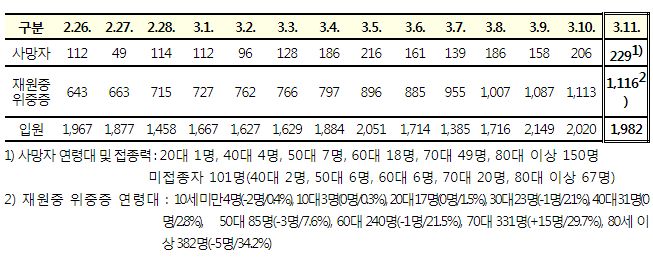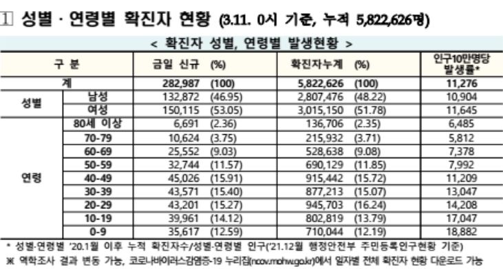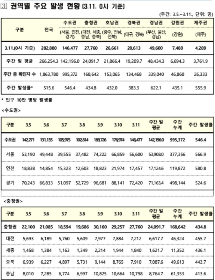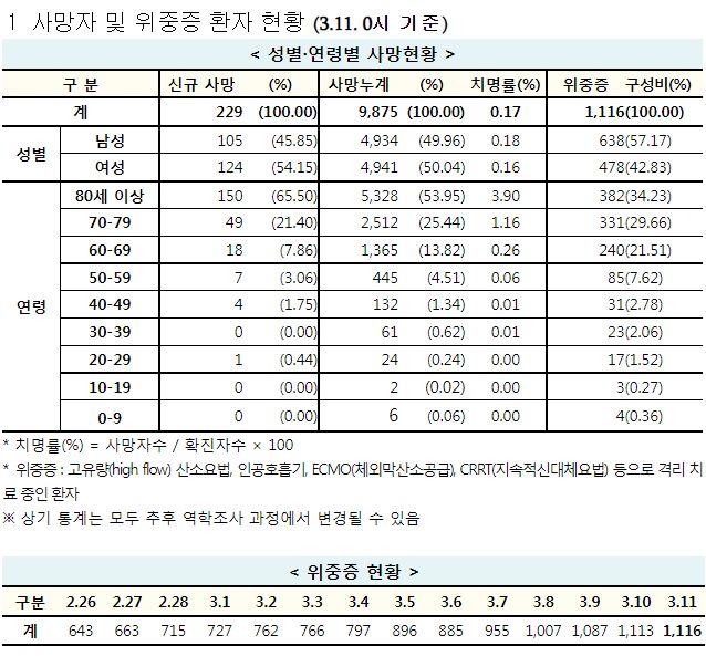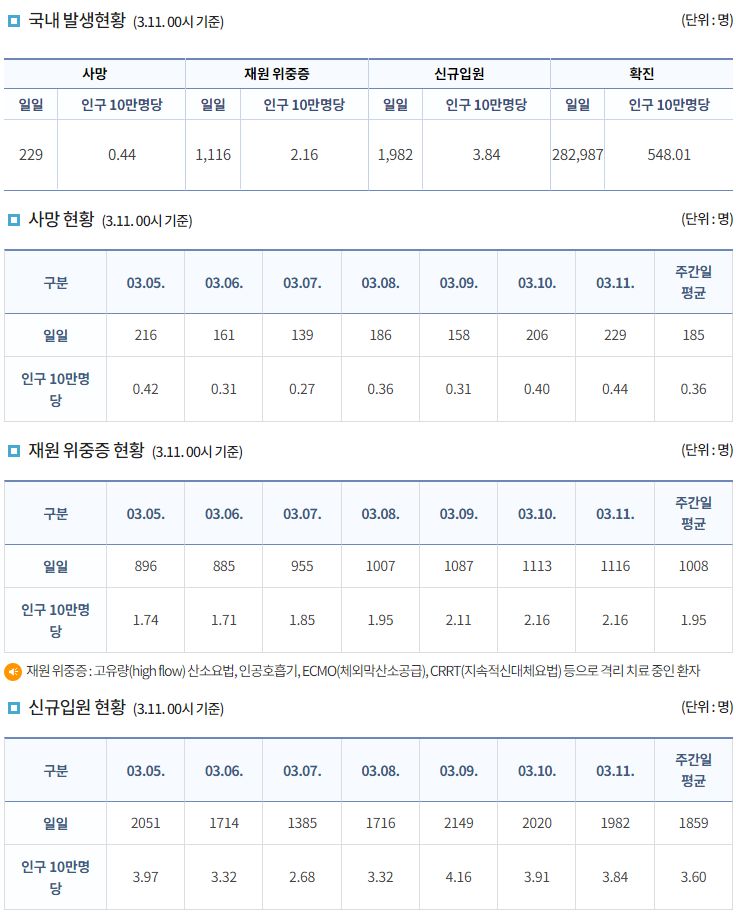 코로나19집계(2022.3.11. 0시기준): 확진 +28.3만, 사망 +229명, 재택치료 132만(집중 19.7만)/:/ 기저질환자 일반병실 본문