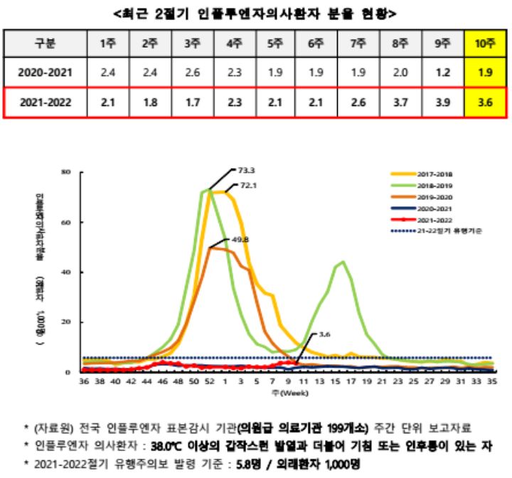 인플루엔자는 유행기준 미만입니다.