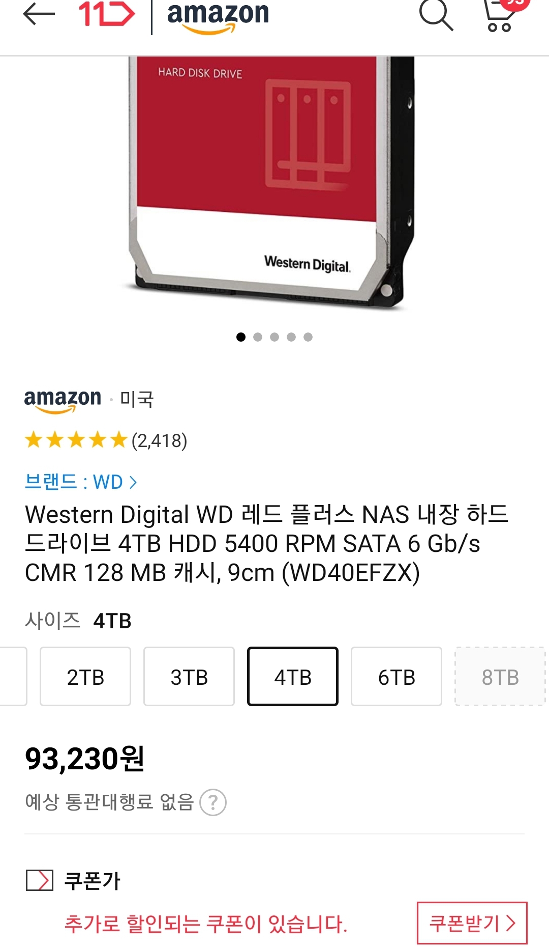 (11번가-아마존) WD 4TB 레드 PLUS CMR HDD (7.9만원/우주패스, 8.4만원/일반) 본문