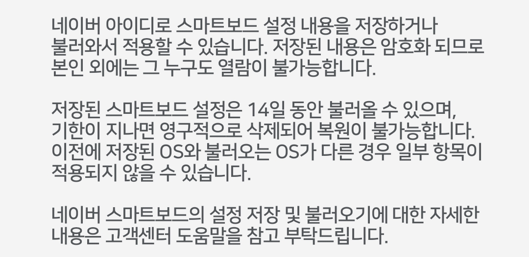 ※ 네이버계정에 가입하지 않아도 쓸 수 있겠지만, 로그인해두면 좋은 점이 있습니다. A단말기 스마트보드앱에서 저장한 설정을, 같은 계정의 B단말기에서 불러와 적용할 수 있습니다.