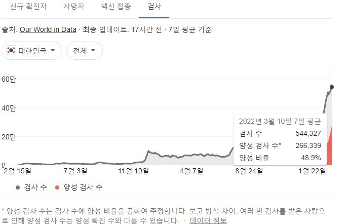 아래 구글그래프의 검사는 집계기준이 뭔지 도통 모르겠어서(요즘은 국내발표대비 50%가 넘는 검사수를 보여주지만, 몇 달 전에는 저 그래프 일일검사수치가 국내발표의 1/5이하, 1/10이기도 했어요) 보통 인용하지 않았는데, 양성비율이 절반이나 된 게 이채로워서 일단 가져와봅니다.