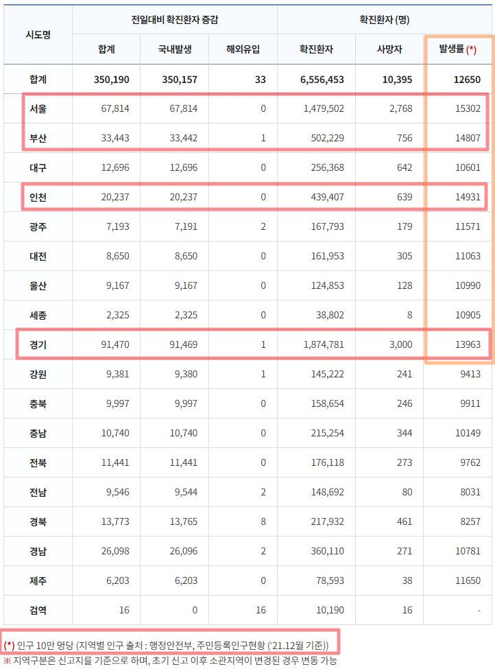 마치 지역별로 인구대비 몇 명이 걸려봤나 레이스가 벌어지기라도 한 느낌이군요.