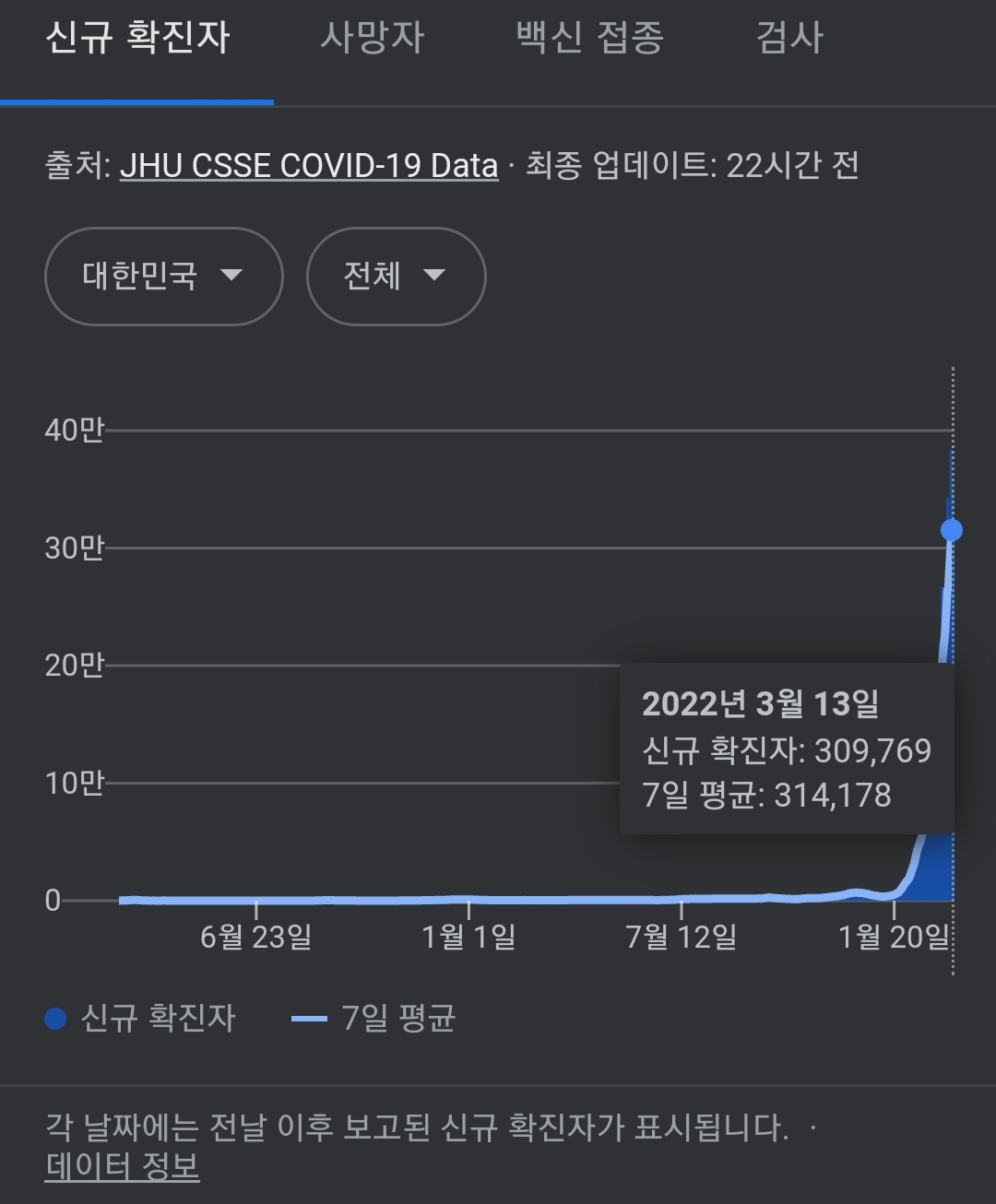 | 코로나19집계(2022.3.13. 0시기준): 확진 +30만, 사망 +251, 중환자병상가동률 67%, 재택 157만(집중 24만) (0) | 2022.03.13 |