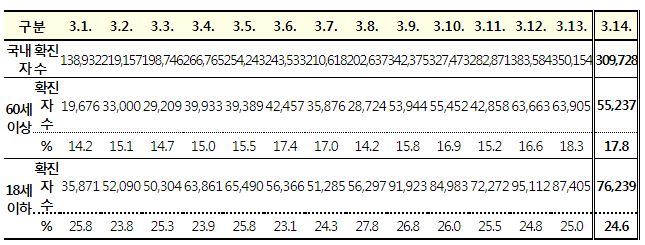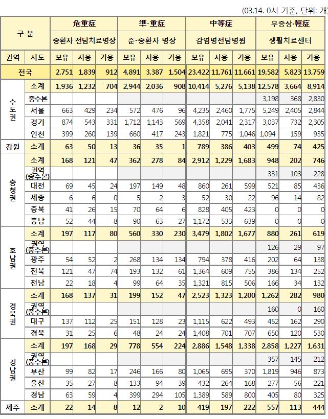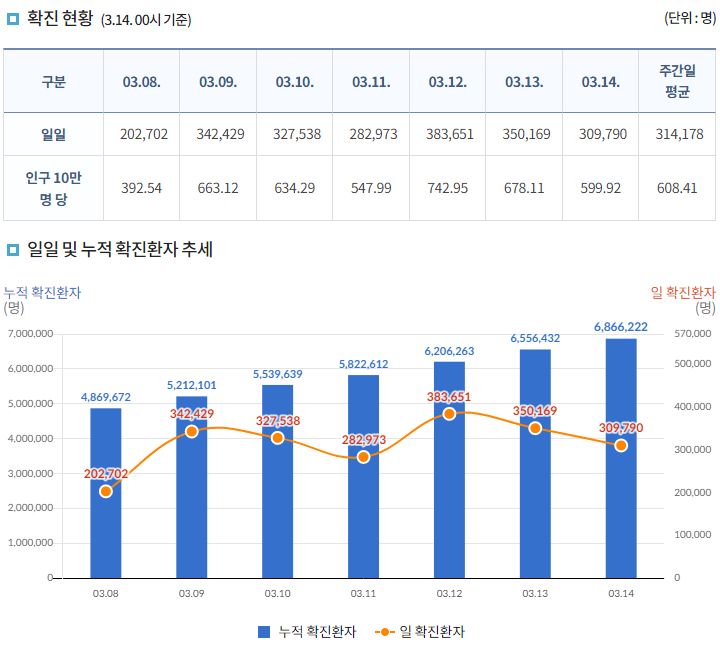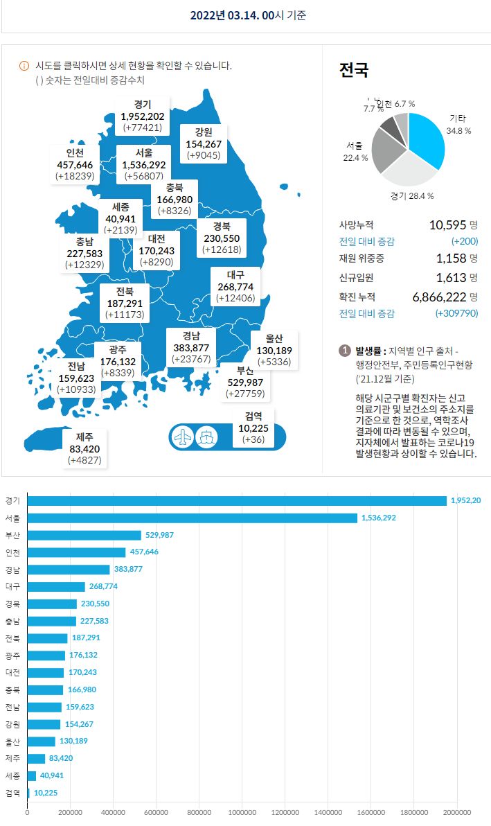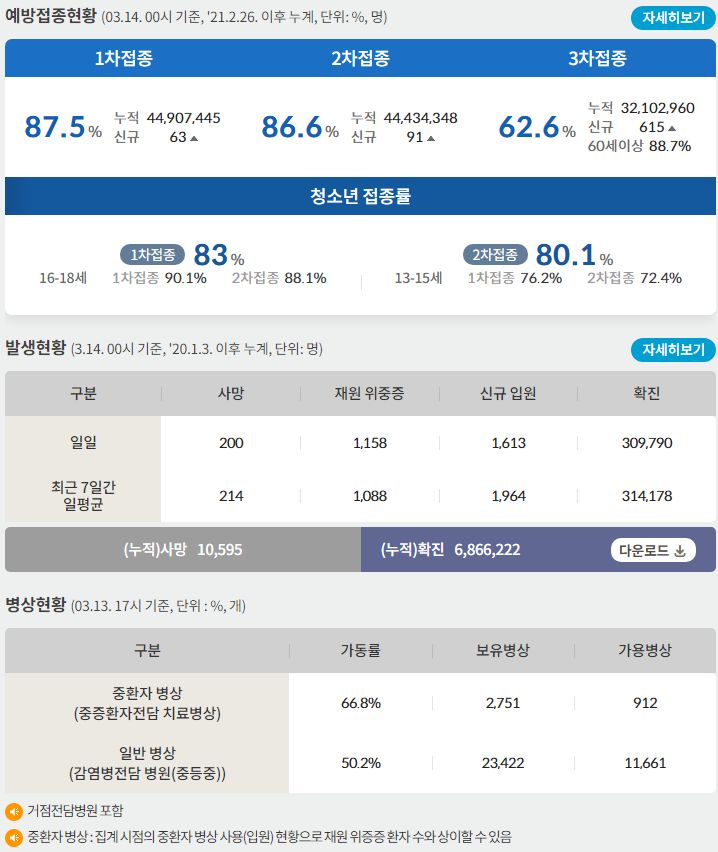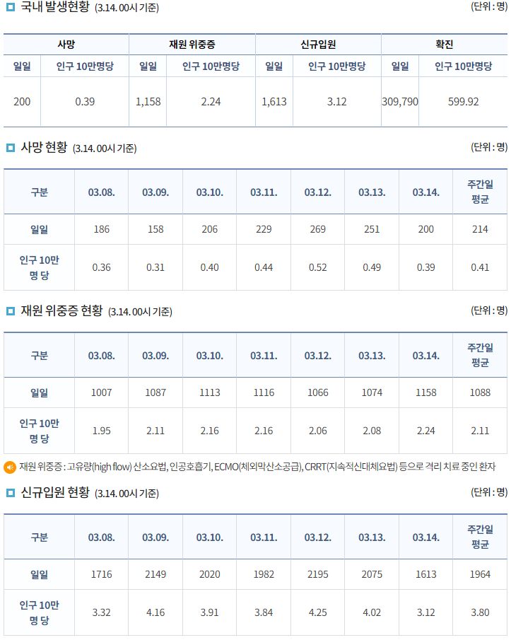 코로나19집계(2022.3.14. 0시기준): 확진 +31.0만, 사망 +200명, 중환자실 가동률 67%, 재택 161만(집중 24.6만) 본문
