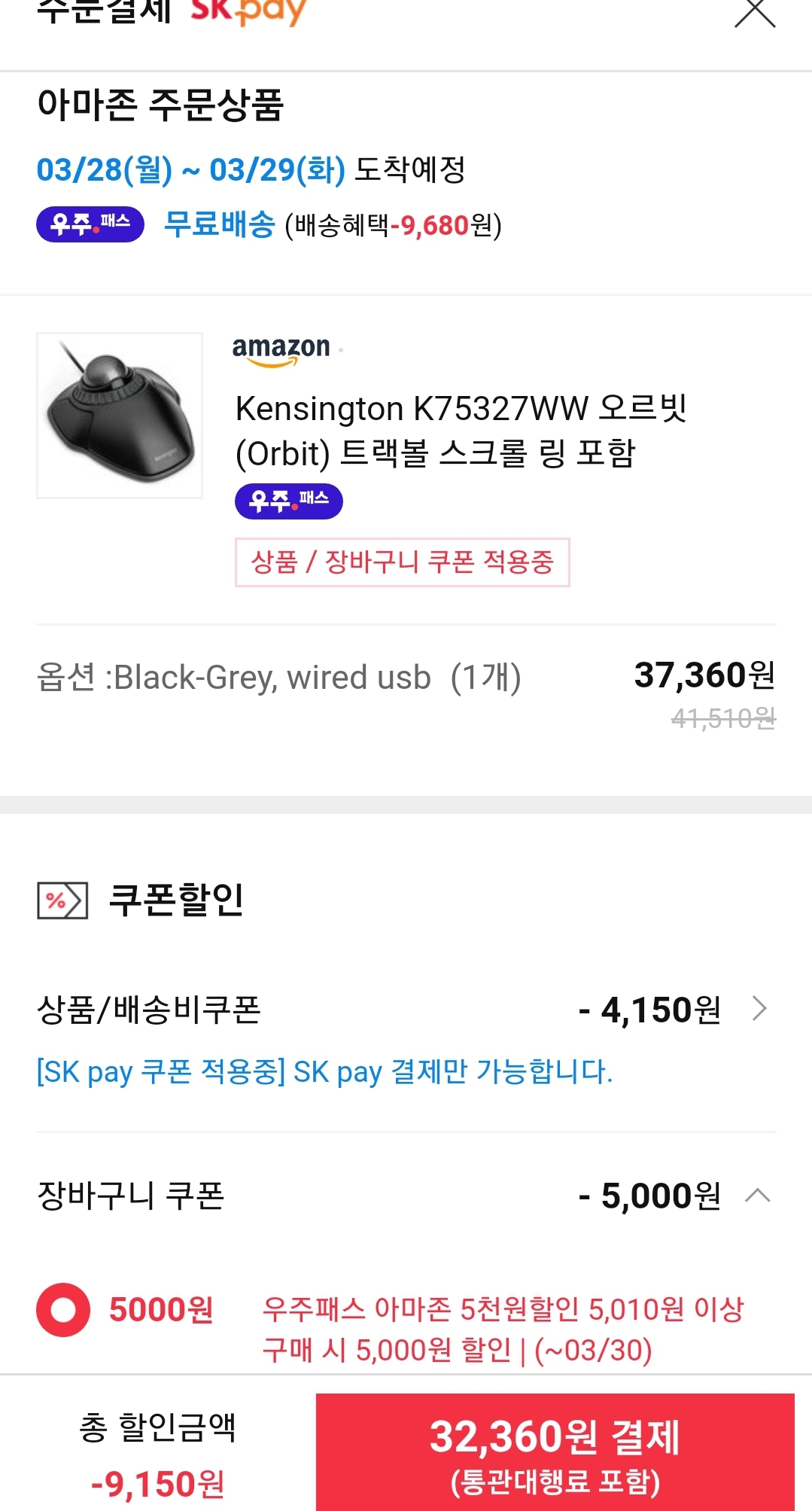 상품페이지에서 아마존위크 10%카드할인쿠폰을 받아, 결제화면에서 그것과 우주패스 5천원 장바구니쿠폰을 적용하면 됩니다.