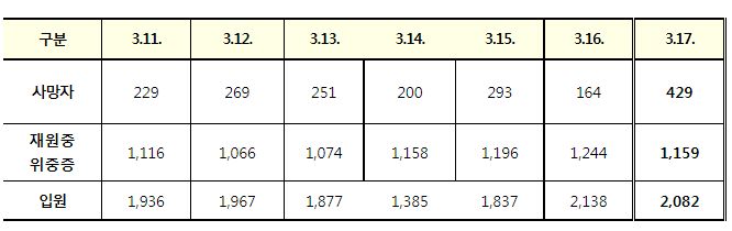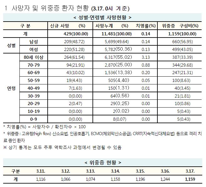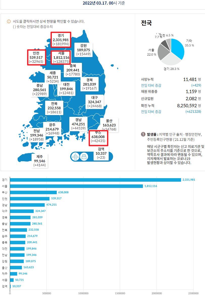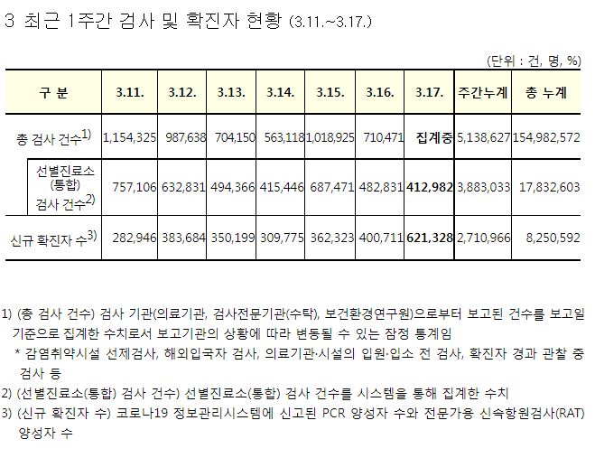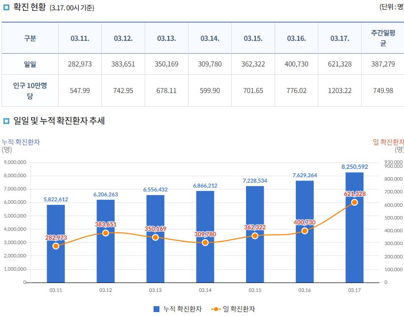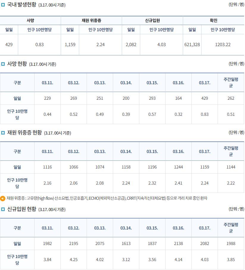 코로나19집계(2022.3.17. 0시기준)★: 확진 +62만, 사망 +429명, 위중증 1159명(중환자실 가동률 66%), 재택치료 193만(집중 29만) 본문