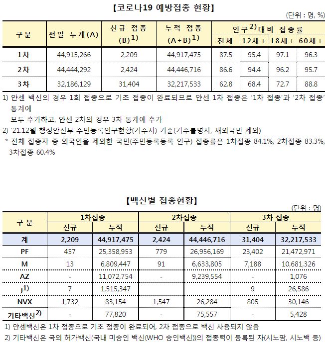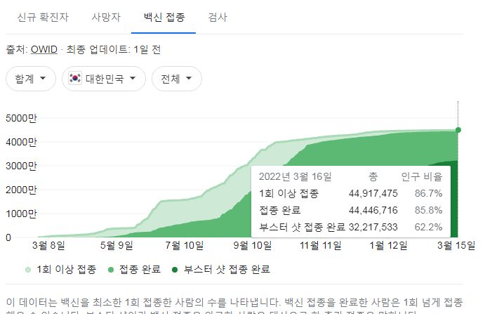 전 인구의 2차접종률은 87%, 3차접종률은 63%입니다. 2차접종 후 4~6개월 지나면(그러니까 작년 6~7월에 화이자 2차맞은 노인이나 AZ 2차맞은 의료종사자 등은 올 1월 정도면) 항체가 팍 떨어진다고 하고, 그런 사람은 돌파감염에 취약하다고 알려져 있지만, 질병청 주간 발표로 보면 일단 2차까지 맞은 사람은 걸리더라도 중증으로 악화된 사례가 매우 적다고 합니다.