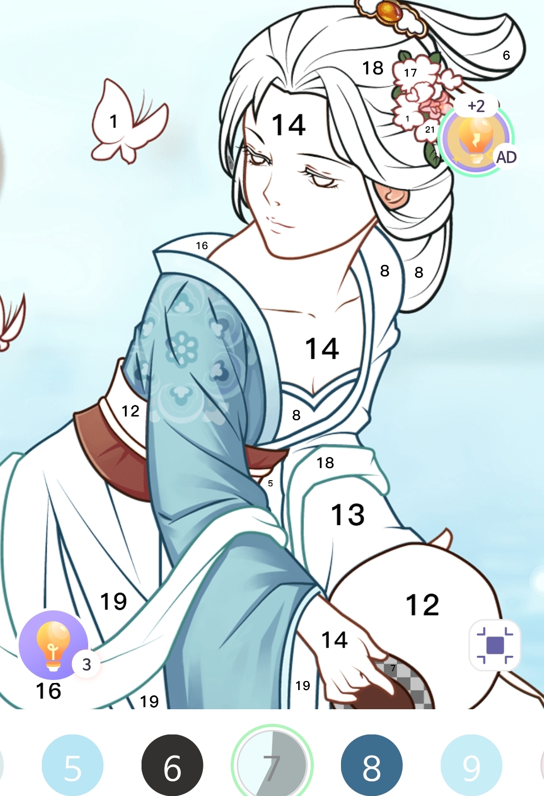 윤곽선만 따놓은 그림이 있고, 아래 범례에서 채울 숫자를 터치해 선택한 다음 위 그림을 축소확대하며 선택표시된 칸을 찾아 채웁니다. 채워갈수록 밑에는 파이차트처럼 완성정도가 표시. 그 색을 다 채우면 그 범례는 사라집니다.
