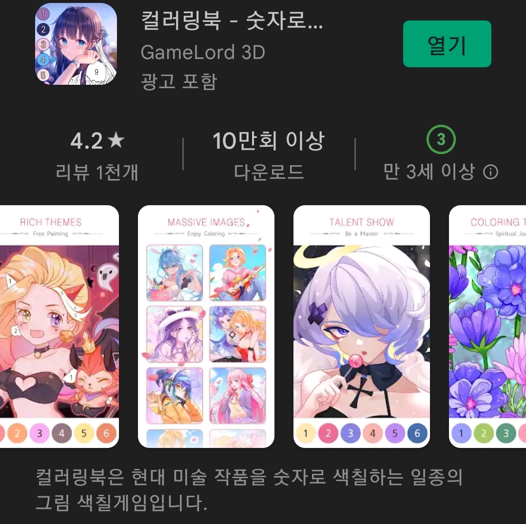 색칠공부라고 하기에는 지정한 칸 에 지정한 색을 터치해 채워 완성하는 방식이라 자유롭지는 않습니다. 퍼즐느낌입니다.